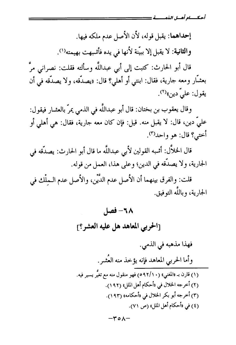 قَالَ أَبُو الْحَارِثِ: كَتَبْتُ إِلَى أَبِي عَبْدِ اللَّهِ وَسَأَلْتُهُ فَقُلْتُ: نَصْرَانِيٌّ مَرَّ بِعَشَّارٍ وَمَعَهُ جَارِيَةٌ، فَقَالَ: ابْنَتِي أَوْ أَهْلِي؟ قَالَ: يُصَدِّقُهُ وَلَا يُصَدِّقُهُ فِي أَنْ يَقُولَ: عَلَيَّ دَيْنٌ.