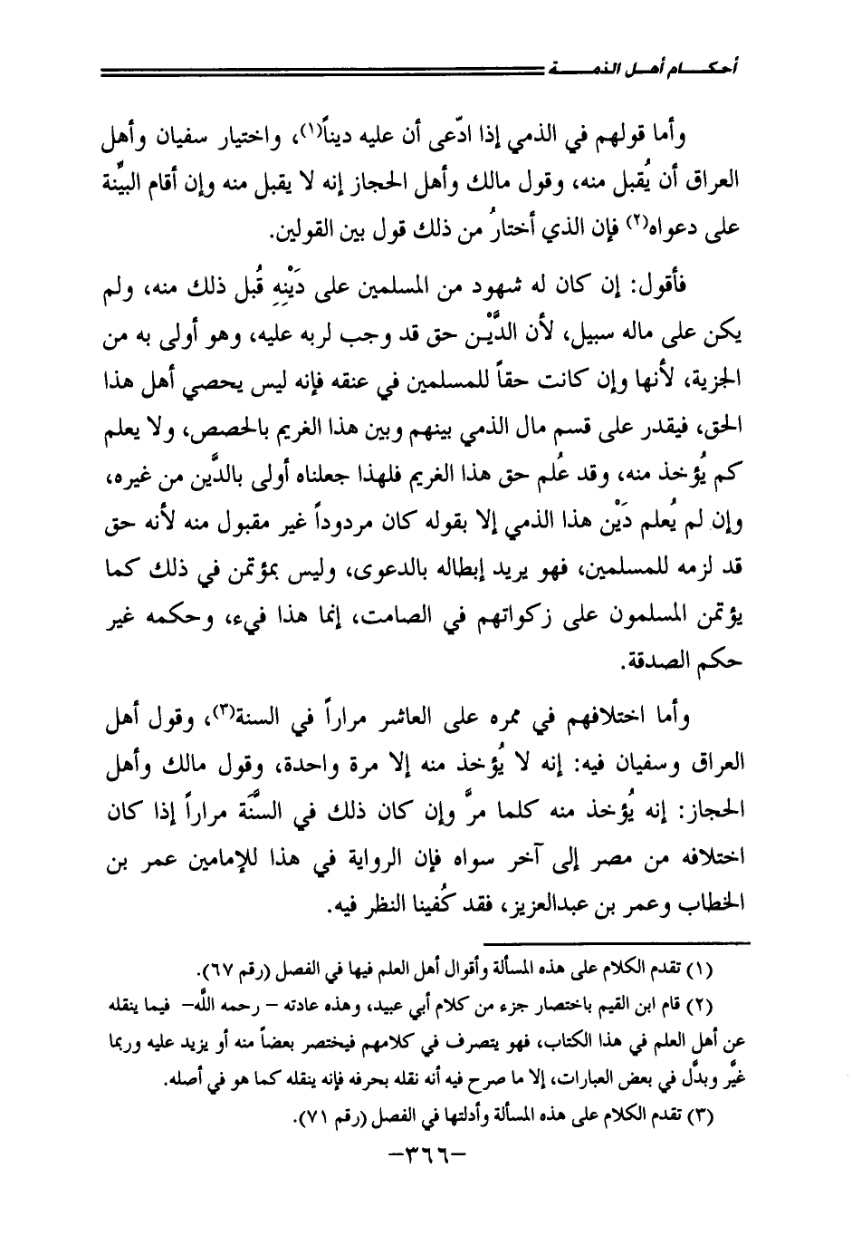وَأَمَّا قَوْلُهُمْ فِي الذِّمِّيِّ إِذَا ادَّعَى أَنَّ عَلَيْهِ دَيْنًا، وَاخْتِيَارُ سُفْيَانَ وَأَهْلِ الْعِرَاقِ أَنْ يُقْبَلَ مِنْهُ، وَقَوْلُ مَالِكٍ وَأَهْلِ الْحِجَازِ إِنَّهُ لَا يُقْبَلُ مِنْهُ وَإِنْ أَقَامَ الْبَيِّنَةَ عَلَى دَعْوَاهُ فَإِنَّ الَّذِي أَخْتَارُ مِنْ ذَلِكَ قَوْلٌ بَيْنَ الْقَوْلَيْنِ.