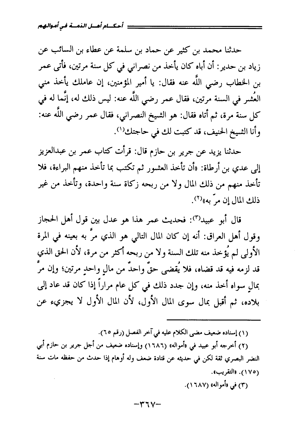 قَالَ أَبُو عُبَيْدٍ: فَحَدِيثُ عُمَرَ هَذَا هُوَ عَدْلٌ بَيْنَ قَوْلِ أَهْلِ الْحِجَازِ وَقَوْلِ أَهْلِ الْعِرَاقِ: أَنَّهُ إِنْ كَانَ الْمَالُ التَّالِي هُوَ الَّذِي مَرَّ بِهِ بِعَيْنِهِ فِي الْمَرَّةِ الْأُولَى لَمْ يُؤْخَذْ مِنْهُ تِلْكَ السَّنَةَ وَلَا مِنْ رِبْحِهِ أَكْثَرُ مِنْ مَرَّةٍ ; لِأَنَّ الْحَقَّ الَّذِي قَدْ لَزِمَهُ فِيهِ قَدْ قَضَاهُ، فَلَا يُقْضَى حَقٌّ وَاحِدٌ مِنْ مَالٍ وَاحِدٍ مَرَّتَيْنِ، وَإِنْ مَرَّ بِمَالٍ سِوَاهُ أُخِذَ مِنْهُ، وَإِنْ جُدِّدَ ذَلِكَ فِي كُلِّ عَامٍ مِرَارًا، إِذْ كَانَ قَدْ عَادَ إِلَى بِلَادِهِ ثُمَّ أَقْبَلَ بِمَالٍ سِوَى الْمَالِ الْأَوَّلِ ; لِأَنَّ الْمَالَ الْأَوَّلَ لَا يُجْزِئُ عَنِ