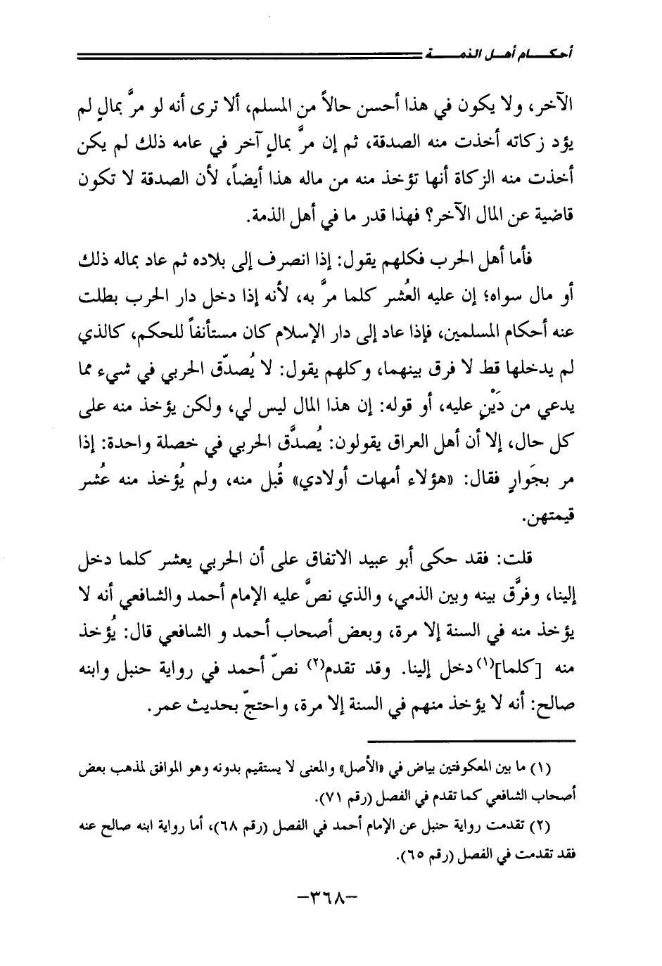 قُلْتُ: فَقَدْ حَكَى أَبُو عُبَيْدٍ الِاتِّفَاقَ عَلَى أَنَّ الْحَرْبِيَّ يُعْشَرُ كُلَّمَا دَخَلَ إِلَيْنَا، وَفَرَّقَ بَيْنَهُ وَبَيْنَ الذِّمِّيِّ، وَالَّذِي نَصَّ عَلَيْهِ الْإِمَامُ أَحْمَدُ وَالشَّافِعِيُّ أَنَّهُ لَا يُؤْخَذُ مِنْهُ فِي السَّنَةِ إِلَّا مَرَّةً، وَبَعْضُ أَصْحَابِ أَحْمَدَ وَالشَّافِعِيِّ قَالَ: يُؤْخَذُ مِنْهُ [كُلَّمَا] دَخَلَ إِلَيْنَا، وَقَدْ تَقَدَّمَ نَصُّ أَحْمَدَ فِي رِوَايَةِ حَنْبَلٍ وَابْنِهِ صَالِحٍ: أَنَّهُ لَا يُؤْخَذُ مِنْهُمْ فِي السَّنَةِ إِلَّا مَرَّةً وَاحْتَجَّ بِحَدِيثِ عُمَرَ.