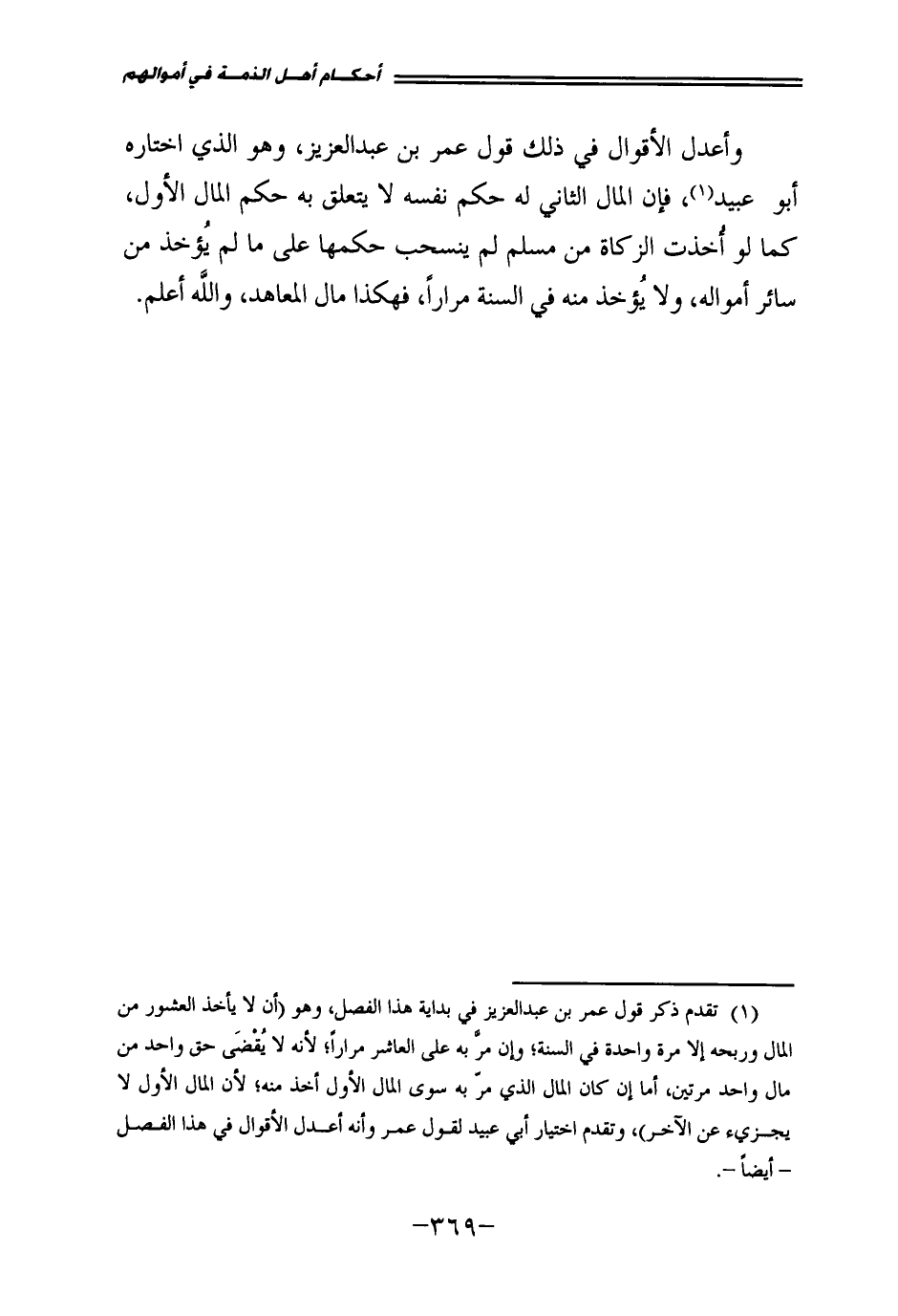 وَأَعْدَلُ الْأَقْوَالِ فِي ذَلِكَ قَوْلُ عُمَرَ بْنِ عَبْدِ الْعَزِيزِ، وَهُوَ الَّذِي اخْتَارَهُ أَبُو عُبَيْدٍ فَإِنَّ الْمَالَ الثَّانِيَ لَهُ حُكْمُ نَفْسِهِ لَا يَتَعَلَّقُ بِهِ حُكْمُ الْمَالِ الْأَوَّلِ، كَمَا لَوْ أُخِذَتِ الزَّكَاةُ مِنْ مُسْلِمٍ لَمْ يَنْسَحِبْ حُكْمُهَا عَلَى مَا لَمْ يُؤْخَذْ مِنْ سَائِرِ أَمْوَالِهِ، وَلَا يُؤْخَذْ مِنْهُ فِي السَّنَةِ مِرَارًا فَهَكَذَا مَالُ الْمَعَاهَدِ، وَاللَّهُ أَعْلَمُ.