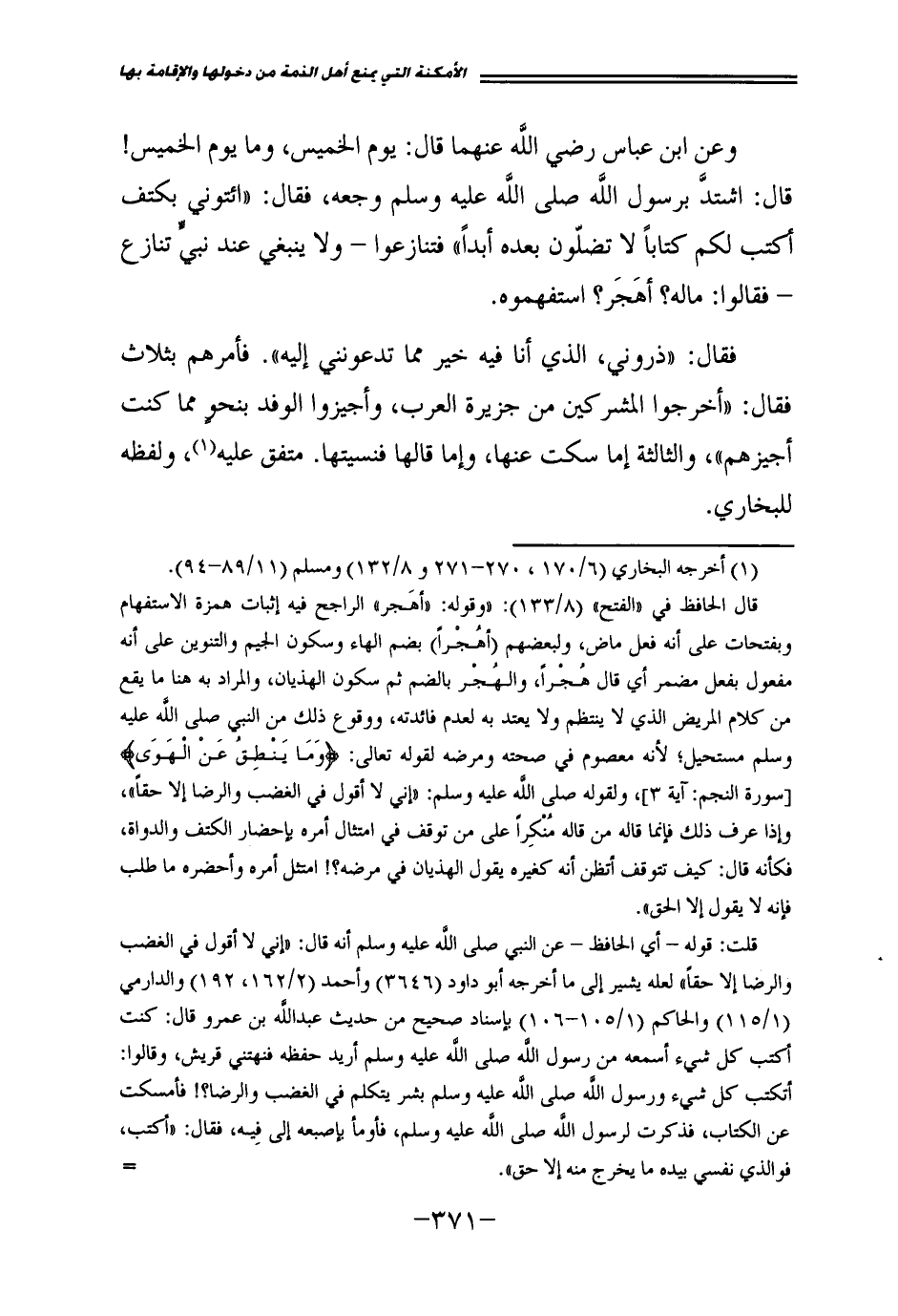 وَعَنِ ابْنِ عَبَّاسٍ رَضِيَ اللَّهُ عَنْهُمَا قَالَ: يَوْمُ الْخَمِيسَ، وَمَا يَوْمُ الْخَمِيسَ! قَالَ: «اشْتَدَّ بِرَسُولِ اللَّهِ - صَلَّى اللَّهُ عَلَيْهِ وَسَلَّمَ - وَجَعُهُ، فَقَالَ: " ائْتُونِي بِكَتِفٍ أَكْتُبُ لَكُمْ كِتَابًا لَا تَضِلُّونَ بَعْدَهُ أَبَدًا " فَتَنَازَعُوا - وَلَا يَنْبَغِي عِنْدَ نَبِيٍّ تَنَازُعٌ - فَقَالُوا: مَا لَهُ؟ أَهَجَرَ؟ اسْتَفْهِمُوهُ.