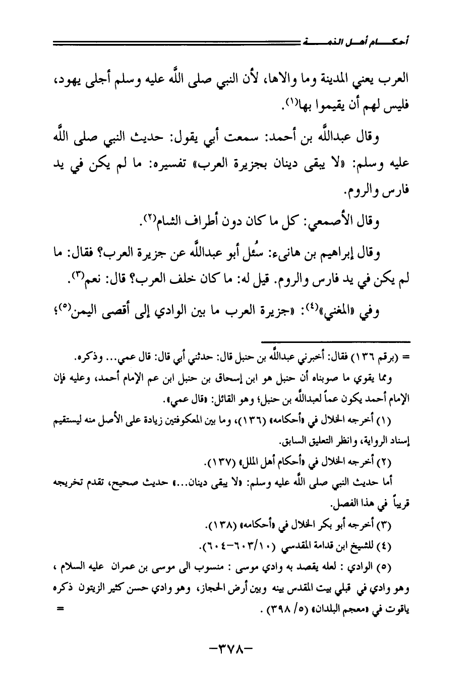 وَقَالَ إِبْرَاهِيمُ بْنُ هَانِئٍ: سُئِلَ أَبُو عَبْدِ اللَّهِ عَنْ جَزِيرَةِ الْعَرَبِ، فَقَالَ: مَا لَمْ يَكُنْ فِي يَدِ فَارِسَ وَالرُّومِ قِيلَ لَهُ: مَا كَانَ خَلْفَ الْعَرَبِ؟ قَالَ: نَعَمْ.