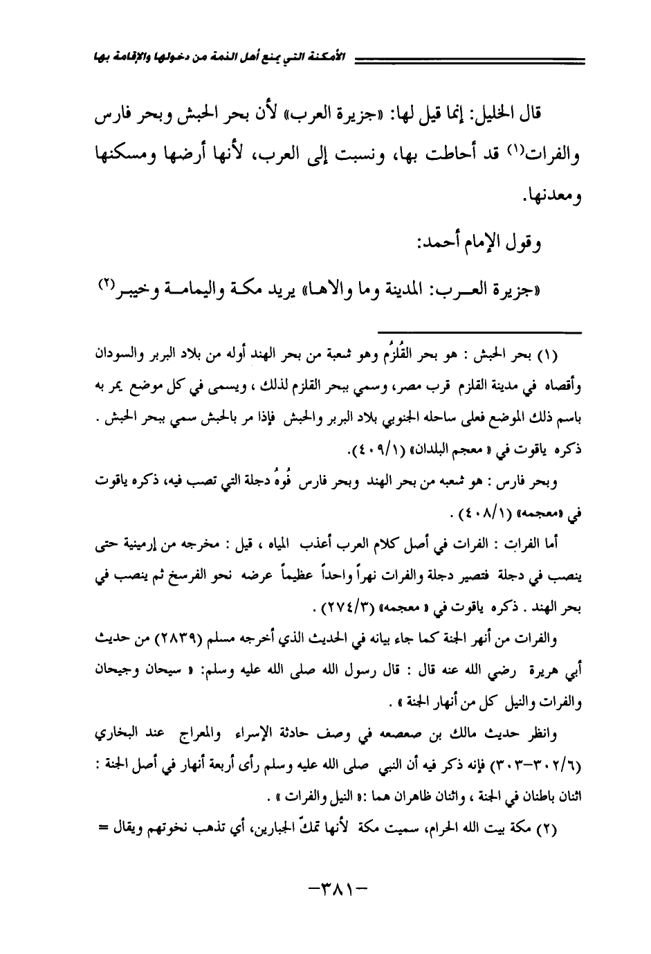 وَقَوْلُ الْإِمَامِ أَحْمَدَ: جَزِيرَةُ الْعَرَبِ: الْمَدِينَةُ وَمَا وَالَاهَا، يُرِيدُ مَكَّةَ وَالْيَمَامَةَ وَخَيْبَرَ