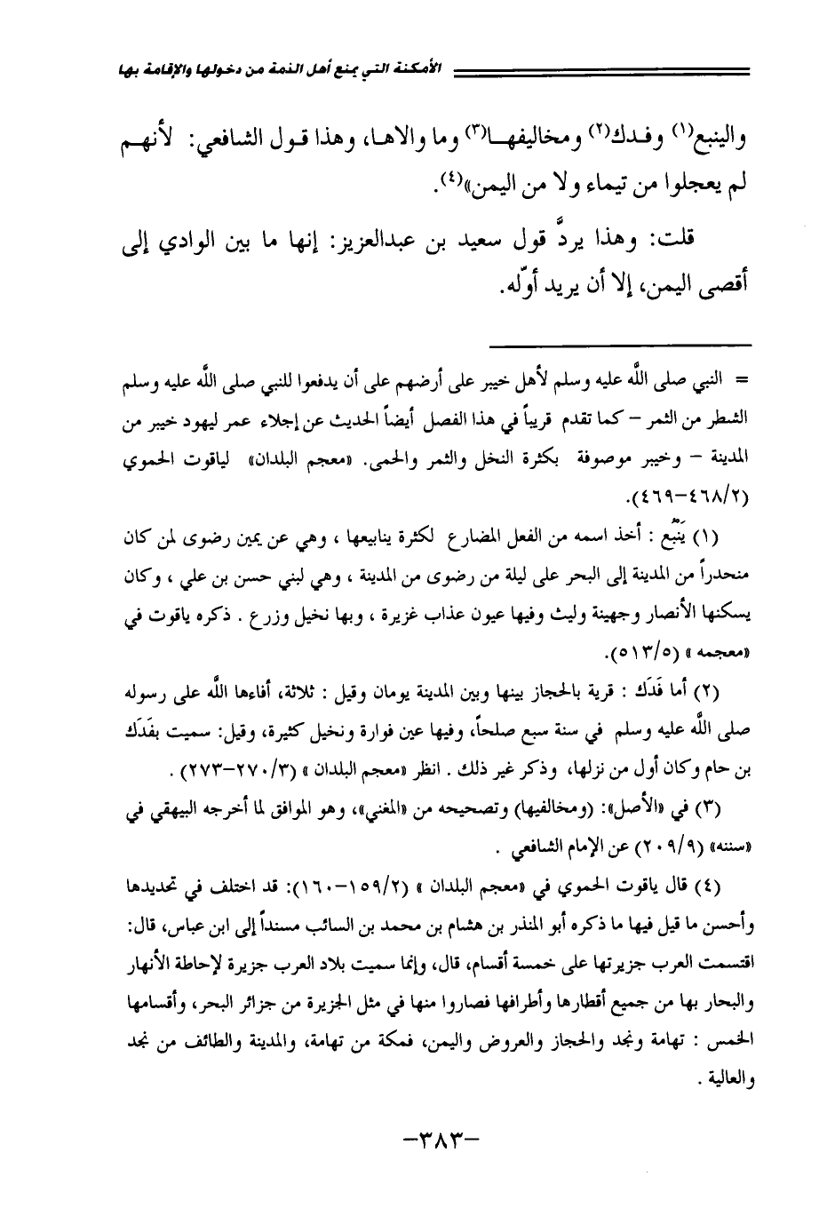وَالْيَنْبُعَ وَفَدَكَ وَمَخَالِيفَهَا وَمَا وَالَاهَا، وَهَذَا قَوْلُ الشَّافِعِيِّ: لِأَنَّهُمْ لَمْ يُعَجِّلُوا مِنْ تَيْمَاءَ وَلَا مِنَ الْيَمَنِ.