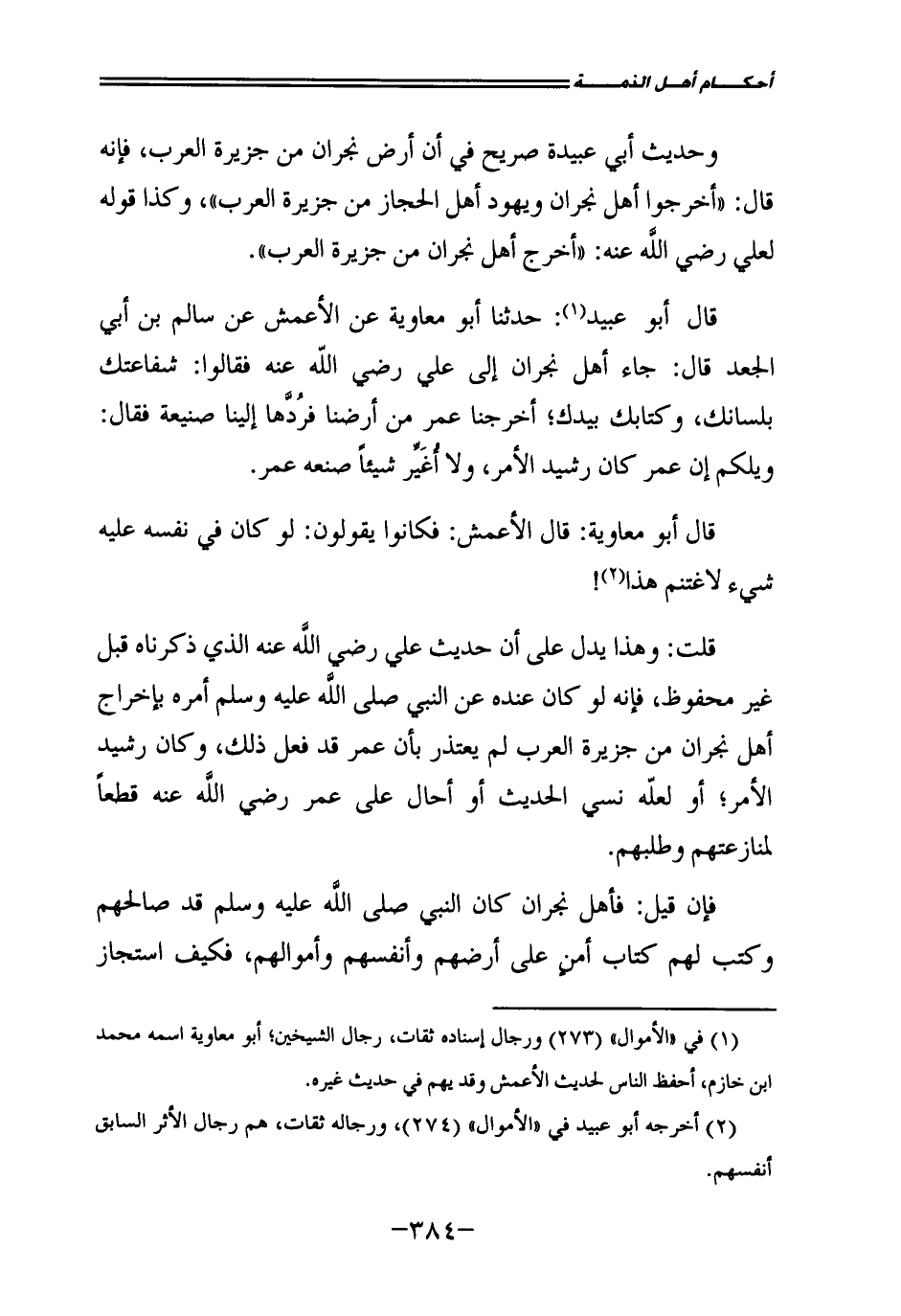قَالَ أَبُو عُبَيْدٍ: حَدَّثَنَا أَبُو مُعَاوِيَةَ عَنِ الْأَعْمَشِ عَنْ سَالِمِ بْنِ أَبِي الْجَعْدِ قَالَ: جَاءَ أَهْلُ نَجْرَانَ إِلَى عَلِيٍّ رَضِيَ اللَّهُ عَنْهُ فَقَالُوا: شَفَاعَتُكَ بِلِسَانِكَ، وَكِتَابُكَ بِيَدِكَ، أَخْرَجَنَا عُمَرُ مِنْ أَرْضِنَا فَرُدَّهَا إِلَيْنَا صَنِيعَةً، فَقَالَ: وَيْلَكُمْ إِنَّ عُمَرَ كَانَ رَشِيدَ الْأَمْرِ وَلَا أُغَيِّرُ شَيْئًا صَنَعَهُ عُمَرُ.