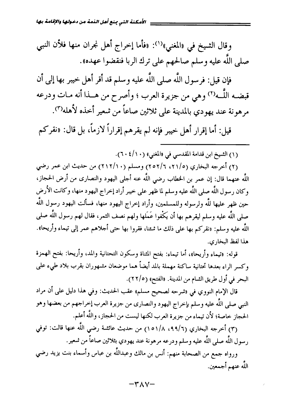 فَإِنْ قِيلَ: فَرَسُولُ اللَّهِ - صَلَّى اللَّهُ عَلَيْهِ وَسَلَّمَ - قَدْ أَقَرَّ أَهْلَ خَيْبَرَ بِهَا إِلَى أَنْ قَبَضَهُ اللَّهُ وَهِيَ مِنْ جَزِيرَةِ الْعَرَبِ، وَأَصْرَحُ مِنْ هَذَا أَنَّهُ مَاتَ وَدِرْعُهُ مَرْهُونَةٌ عِنْدَ يَهُودِيٍّ بِالْمَدِينَةِ عَلَى ثَلَاثِينَ صَاعًا مِنْ شَعِيرٍ أَخَذَهُ لِأَهْلِهِ.