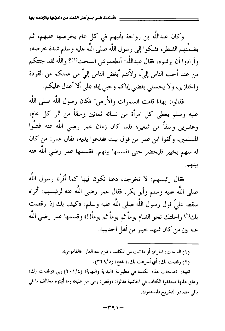 فَقَالَ رَئِيسُهُمْ: لَا تُخْرِجْنَا، دَعْنَا نَكُنْ فِيهَا كَمَا أَقَرَّنَا رَسُولُ اللَّهِ - صَلَّى اللَّهُ عَلَيْهِ وَسَلَّمَ - وَأَبُو بَكْرٍ، فَقَالَ عُمَرُ رَضِيَ اللَّهُ عَنْهُ لِرَئِيسِهِمْ: أَتَرَاهُ سَقَطَ عَلَيَّ قَوْلُ رَسُولِ اللَّهِ - صَلَّى اللَّهُ عَلَيْهِ وَسَلَّمَ -: " كَيْفَ بِكَ إِذَا رَقَصَتْ بِكَ رَاحِلَتُكَ نَحْوَ الشَّامِ يَوْمًا ثُمَّ يَوْمًا ثُمَّ يَوْمًا "، وَقَسَّمَهَا عُمَرُ رَضِيَ اللَّهُ عَنْهُ بَيْنَ مَنْ كَانَ شَهِدَ خَيْبَرَ مِنْ أَهْلِ الْحُدَيْبِيَةِ» .