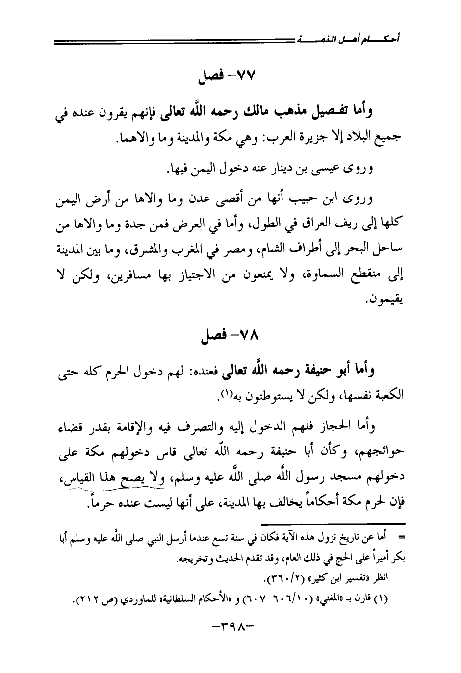 وَأَمَّا تَفْصِيلُ مَذْهَبِ مَالِكٍ رَحِمَهُ اللَّهُ تَعَالَى، فَإِنَّهُمْ يُقَرُّونَ عِنْدَهُ فِي جَمِيعِ الْبِلَادِ إِلَّا جَزِيرَةَ الْعَرَبِ: وَهِيَ مَكَّةُ وَالْمَدِينَةُ وَمَا وَالَاهُمَا.