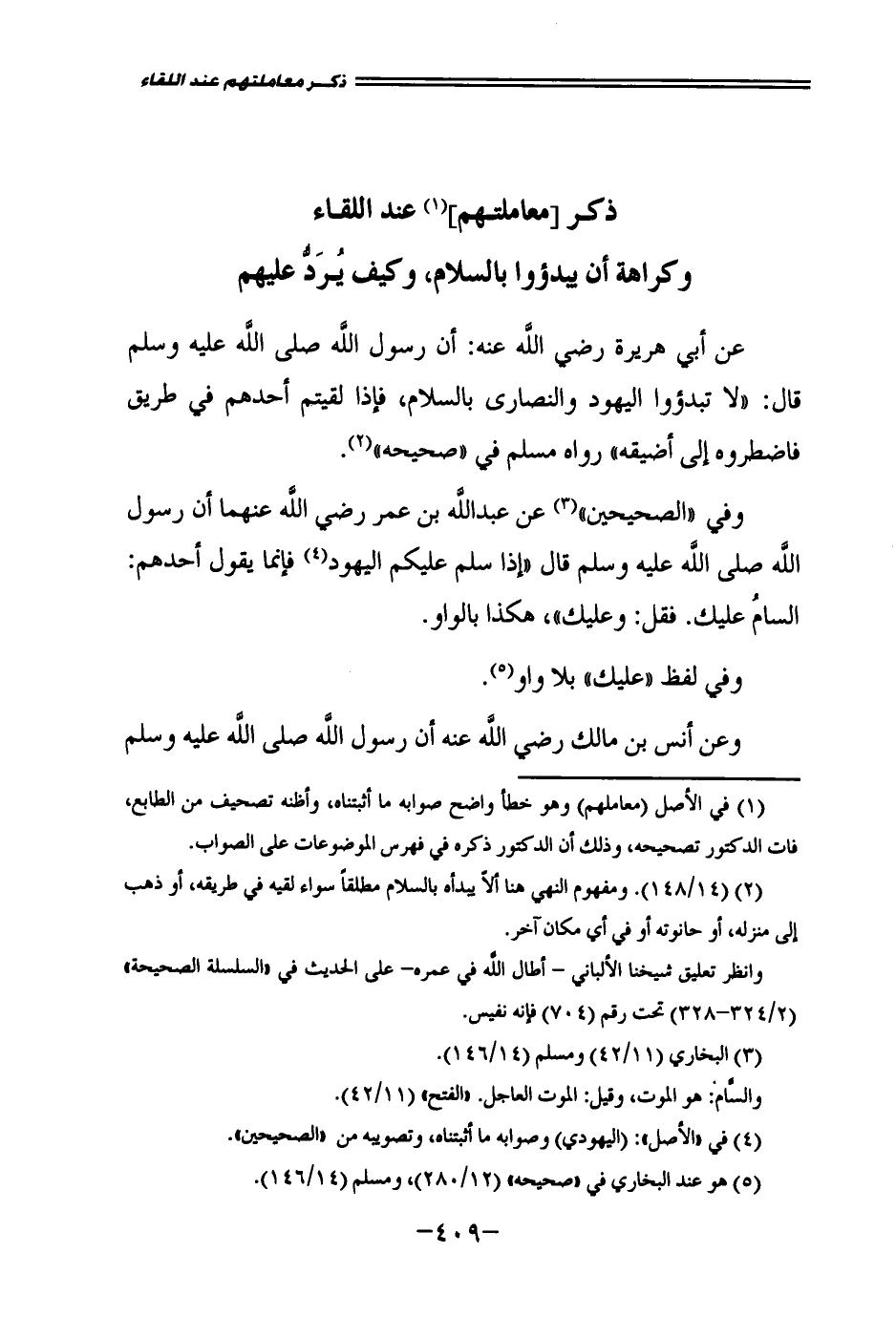 ذِكْرُ [مُعَامَلَتِهِمْ] عِنْدَ اللِّقَاءِ وَكَرَاهَةِ أَنْ يُبْدَءُوا بِالسَّلَامِ وَكَيْفَ يُرَدُّ عَلَيْهِمْ.