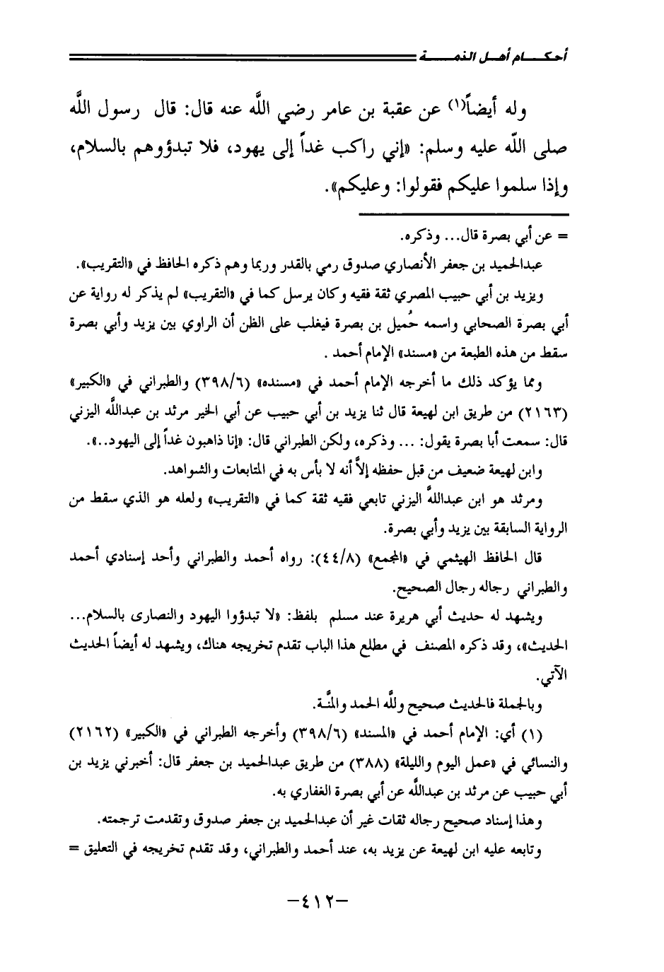 وَلَهُ أَيْضًا عَنْ عُقْبَةَ بْنِ عَامِرٍ رَضِيَ اللَّهُ عَنْهُ قَالَ: قَالَ رَسُولُ اللَّهِ - صَلَّى اللَّهُ عَلَيْهِ وَسَلَّمَ -: " «إِنِّي رَاكِبٌ غَدًا إِلَى يَهُودَ فَلَا تَبْدَءُوهُمْ بِالسَّلَامِ، وَإِذَا سَلَّمُوا عَلَيْكُمْ فَقُولُوا: وَعَلَيْكُمْ» ".