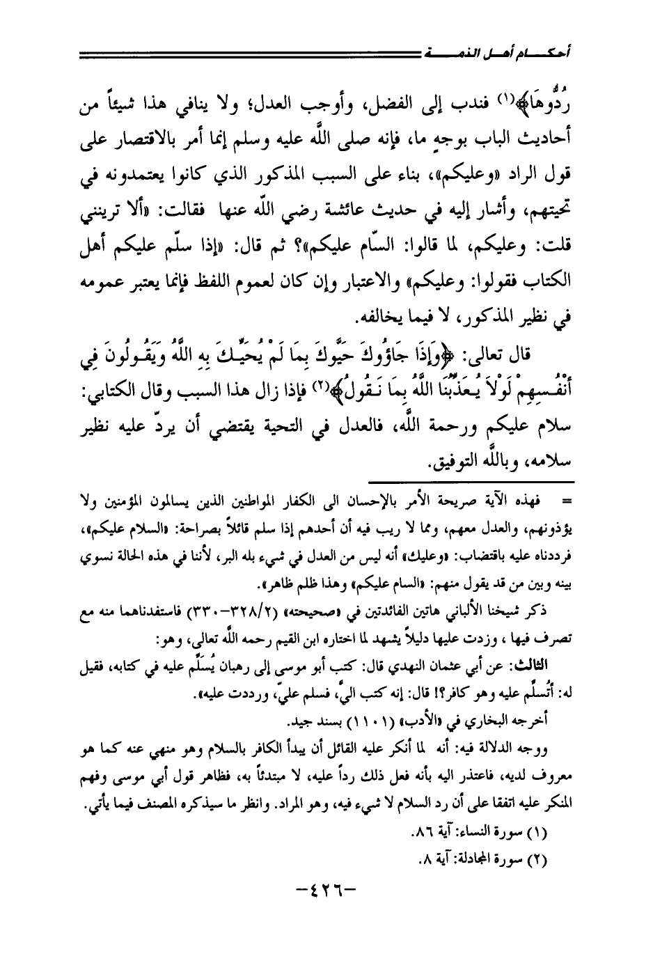 قَالَ تَعَالَى: {وَإِذَا جَاءُوكَ حَيَّوْكَ بِمَا لَمْ يُحَيِّكَ بِهِ اللَّهُ وَيَقُولُونَ فِي أَنْفُسِهِمْ لَوْلَا يُعَذِّبُنَا اللَّهُ بِمَا نَقُولُ} [المجادلة: 8] ، فَإِذَا زَالَ هَذَا السَّبَبُ وَقَالَ الْكِتَابِيُّ: سَلَامٌ عَلَيْكُمْ وَرَحْمَةُ اللَّهِ فَالْعَدْلُ فِي التَّحِيَّةِ يَقْتَضِي أَنْ يَرُدَّ عَلَيْهِ نَظِيرَ سَلَامِهِ وَبِاللَّهِ التَّوْفِيقُ.