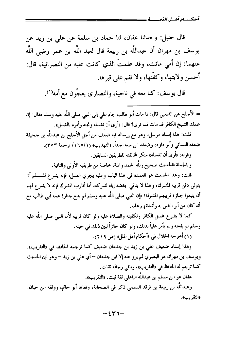 قَالَ حَنْبَلٌ: وَحَدَّثَنَا عَفَّانُ، ثَنَا حَمَّادُ بْنُ سَلَمَةَ عَنْ عَلِيِّ بْنِ زَيْدٍ عَنْ يُوسُفَ بْنِ مِهْرَانَ أَنَّ عَبْدَ اللَّهِ بْنَ رَبِيعَةَ قَالَ لِعَبْدِ اللَّهِ بْنِ عُمَرَ رَضِيَ اللَّهُ عَنْهُمَا: إِنَّ أُمِّي مَاتَتْ، وَقَدْ عَلِمْتَ الَّذِي كَانَتْ عَلَيْهِ مِنَ النَّصْرَانِيَّةِ، قَالَ: أَحْسِنْ وِلَايَتَهَا، وَكَفِّنْهَا، وَلَا تَقُمْ عَلَى قَبْرِهَا.