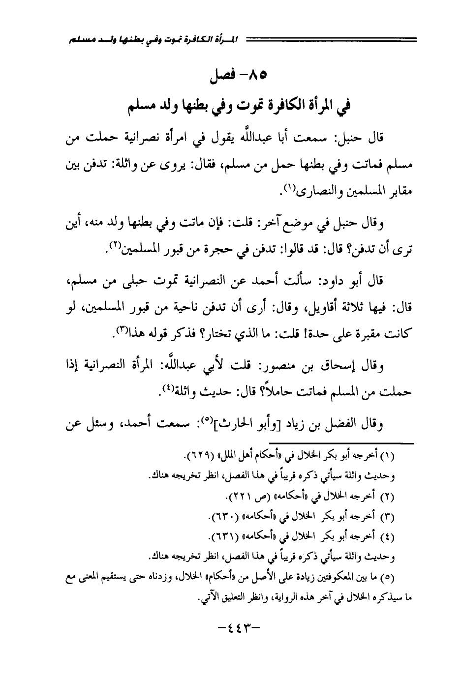 قَالَ حَنْبَلٌ: سَمِعْتُ أَبَا عَبْدِ اللَّهِ يَقُولُ فِي امْرَأَةٍ نَصْرَانِيَّةٍ حَمَلَتْ مِنْ مُسْلِمٍ فَمَاتَتْ وَفِي بَطْنِهَا حَمْلٌ مِنْ مُسْلِمٍ، فَقَالَ: يُرْوَى عَنْ وَاثِلَةَ: تُدْفَنُ بَيْنَ مَقَابِرِ الْمُسْلِمِينَ وَالنَّصَارَى.