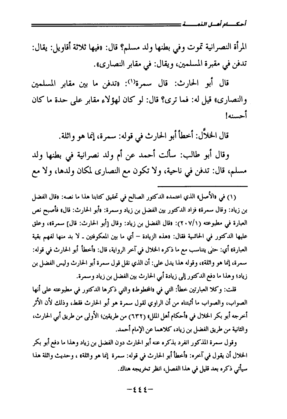 وَقَالَ أَبُو طَالِبٍ: سَأَلْتُ أَحْمَدَ عَنْ أُمِّ وَلَدٍ نَصْرَانِيَّةٍ فِي بَطْنِهَا وَلَدُ مُسْلِمٍ، قَالَ: تُدْفَنُ فِي نَاحِيَةٍ، وَلَا تَكُونُ مَعَ النَّصَارَى لِمَكَانِ وَلَدِهَا، وَلَا مَعَ
