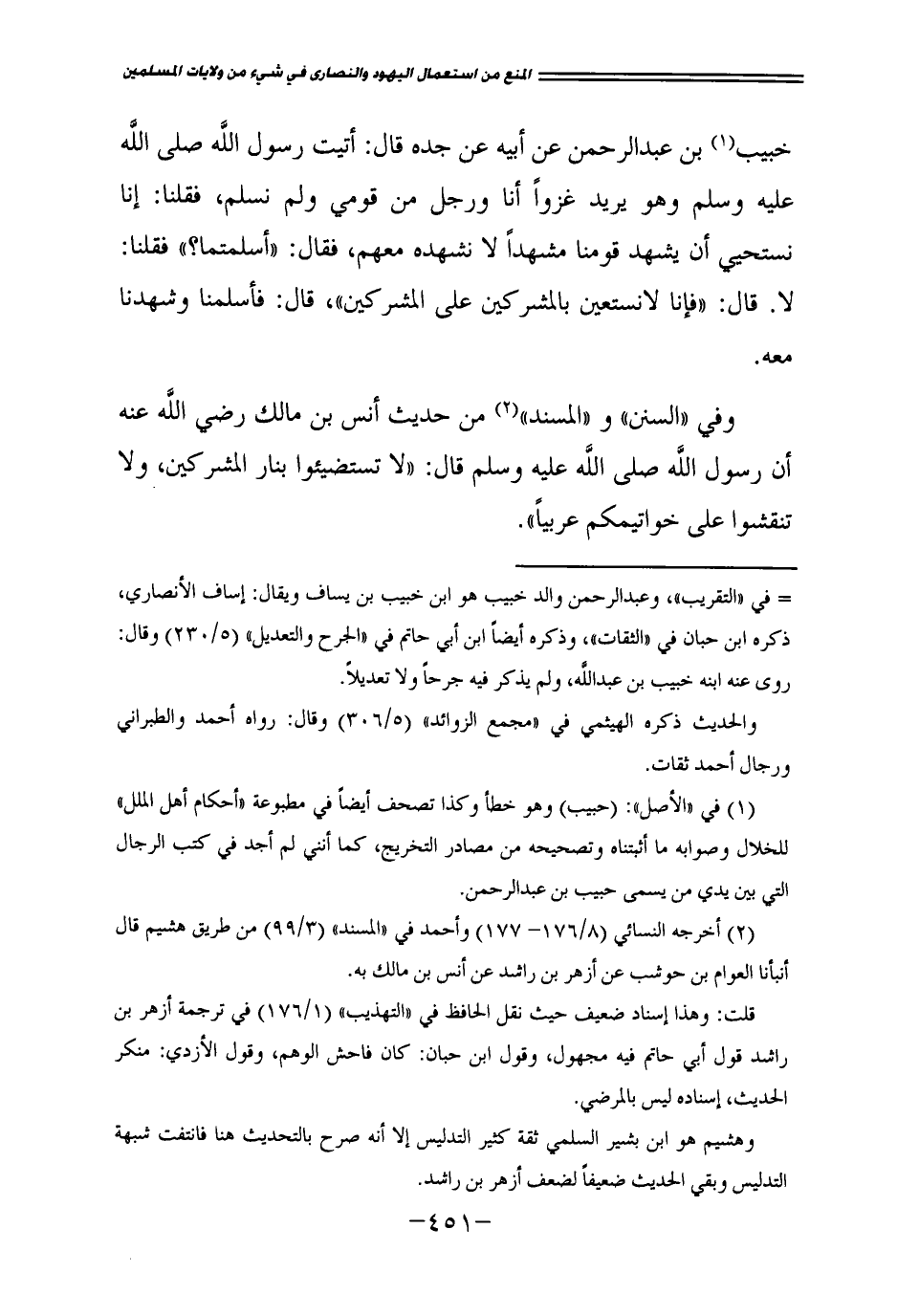 خُبَيْبِ بْنِ عَبْدِ الرَّحْمَنِ عَنْ أَبِيهِ عَنْ جَدِّهِ قَالَ: «أَتَيْتُ رَسُولَ اللَّهِ - صَلَّى اللَّهُ عَلَيْهِ وَسَلَّمَ - وَهُوَ يُرِيدُ غَزْوًا أَنَا وَرَجُلٌ مِنْ قَوْمِي وَلَمْ نُسْلِمْ، فَقُلْنَا: إِنَّا نَسْتَحْيِي أَنْ يَشْهَدَ قَوْمُنَا مَشْهَدًا لَا نَشْهَدُهُ مَعَهُمْ، فَقَالَ: " أَسْلَمْتُمَا "؟ فَقُلْنَا: لَا، قَالَ: " فَإِنَّا لَا نَسْتَعِينُ بِالْمُشْرِكِينَ عَلَى الْمُشْرِكِينَ "، قَالَ: فَأَسْلَمْنَا وَشَهِدْنَا مَعَهُ» .