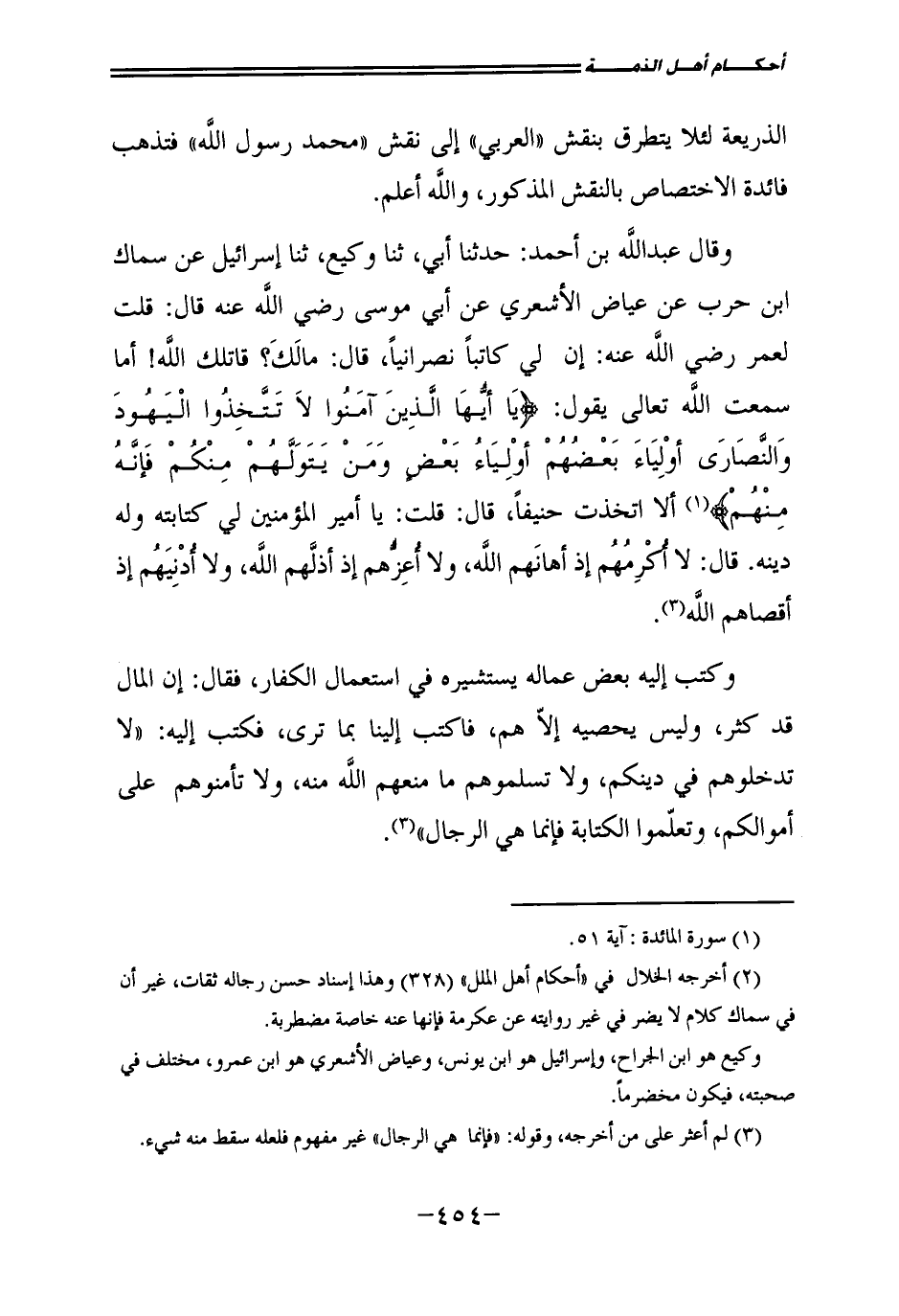 وَقَالَ عَبْدُ اللَّهِ بْنُ أَحْمَدَ: حَدَّثَنَا أَبِي ثَنَا وَكِيعٌ، ثَنَا إِسْرَائِيلُ عَنْ سِمَاكِ بْنِ حَرْبٍ عَنْ عِيَاضٍ الْأَشْعَرِيِّ عَنْ أَبِي مُوسَى رَضِيَ اللَّهُ عَنْهُ قَالَ: قُلْتُ لِعُمَرَ رَضِيَ اللَّهُ عَنْهُ: إِنَّ لِي كَاتِبًا نَصْرَانِيًّا، قَالَ: مَالِكٌ؟ قَاتَلَكَ اللَّهُ! أَمَّا سَمِعْتَ اللَّهَ تَعَالَى يَقُولُ: {يَاأَيُّهَا الَّذِينَ آمَنُوا لَا تَتَّخِذُوا الْيَهُودَ وَالنَّصَارَى أَوْلِيَاءَ بَعْضُهُمْ أَوْلِيَاءُ بَعْضٍ وَمَنْ يَتَوَلَّهُمْ مِنْكُمْ فَإِنَّهُ مِنْهُمْ} [المائدة: 51] ، أَلَا اتَّخَذْتَ حَنِيفًا، قَالَ: قُلْتُ: يَا أَمِيرَ الْمُؤْمِنِينَ لِي كِتَابَتُهُ وَلَهُ دِينُهُ، قَالَ: لَا أُكْرِمْهُمْ إِذْ أَهَانَهُمُ اللَّهُ وَلَا أُعِزُّهُمْ إِذْ أَذَلَّهُمُ اللَّهُ، وَلَا أُدْنِيهِمْ إِذْ أَقْصَاهُمُ اللَّهُ.