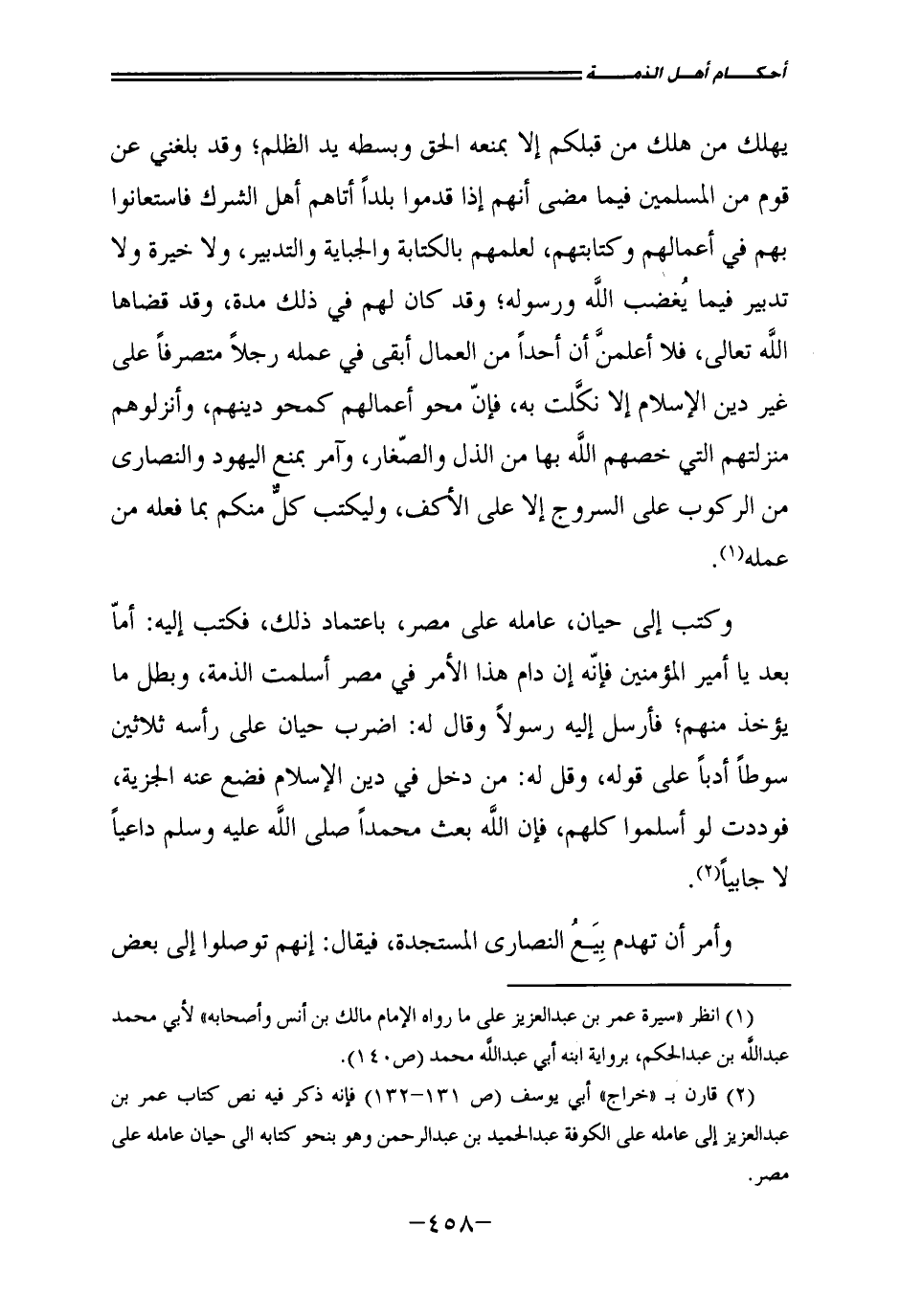 يَهْلِكْ مَنْ هَلَكَ مِنْ قَبْلِكُمْ إِلَّا بِمَنْعِهِ الْحَقَّ وَبَسْطِهِ يَدَ الظُّلْمِ، وَقَدْ بَلَغَنِي عَنْ قَوْمٍ مِنَ الْمُسْلِمِينَ فِيمَا مَضَى أَنَّهُمْ إِذَا قَدِمُوا بَلَدًا أَتَاهُمْ أَهْلُ الشِّرْكِ فَاسْتَعَانُوا بِهِمْ فِي أَعْمَالِهِمْ وَكِتَابَتِهِمْ لِعِلْمِهِمْ بِالْكِتَابَةِ وَالْجِبَايَةِ وَالتَّدْبِيرِ، وَلَا خِيرَةَ وَلَا تَدْبِيرَ فِيمَا يَغْضَبُ اللَّهُ وَرَسُولُهُ، وَقَدْ كَانَ لَهُمْ فِي ذَلِكَ مُدَّةٌ وَقَدْ قَضَاهَا اللَّهُ تَعَالَى، فَلَا أَعْلَمَنَّ أَنَّ أَحَدًا مِنَ الْعُمَّالِ أَبْقَى فِي عَمَلِهِ رَجُلًا مُتَصَرِّفًا عَلَى غَيْرِ دِينِ الْإِسْلَامِ إِلَّا نَكَّلْتُ بِهِ، فَإِنَّ مَحْوَ أَعْمَالِهِمْ كَمَحْوِ دِينِهِمْ، وَأَنْزِلُوهُمْ مَنْزِلَتَهُمُ الَّتِي خَصَّهُمُ اللَّهُ بِهَا مِنَ الذُّلِّ وَالصَّغَارِ، وَآمُرُ بِمَنْعِ الْيَهُودِ وَالنَّصَارَى مِنَ الرُّكُوبِ عَلَى السُّرُوجِ إِلَّا عَلَى الْأُكُفِ، وَلْيَكْتُبْ كُلٌّ مِنْكُمْ بِمَا فَعَلَهُ مِنْ عَمَلِهِ.