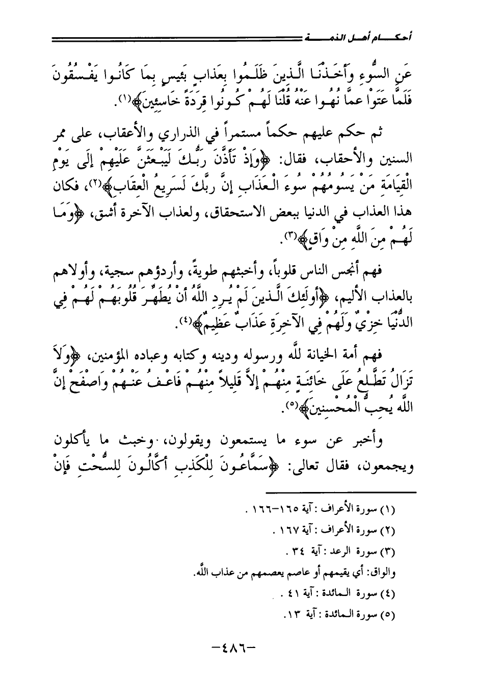 ثُمَّ حَكَمَ عَلَيْهِمْ حُكْمًا مُسْتَمِرًّا فِي الذَّرَارِيِّ وَالْأَعْقَابِ، عَلَى مَرِّ السِّنِينَ وَالْأَحْقَابِ، فَقَالَ: {وَإِذْ تَأَذَّنَ رَبُّكَ لَيَبْعَثَنَّ عَلَيْهِمْ إِلَى يَوْمِ الْقِيَامَةِ مَنْ يَسُومُهُمْ سُوءَ الْعَذَابِ إِنَّ رَبَّكَ لَسَرِيعُ الْعِقَابِ} [الأعراف: 167] ، فَكَانَ هَذَا الْعَذَابُ فِي الدُّنْيَا بِبَعْضِ الِاسْتِحْقَاقِ، وَلَعَذَابُ الْآخِرَةِ أَشَقُّ {وَمَا لَهُمْ مِنَ اللَّهِ مِنْ وَاقٍ} [الرعد: 34] .