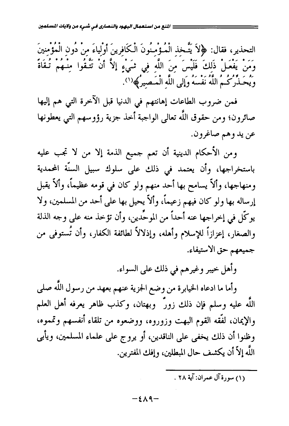 التَّحْذِيرِ فَقَالَ: {لَا يَتَّخِذِ الْمُؤْمِنُونَ الْكَافِرِينَ أَوْلِيَاءَ مِنْ دُونِ الْمُؤْمِنِينَ وَمَنْ يَفْعَلْ ذَلِكَ فَلَيْسَ مِنَ اللَّهِ فِي شَيْءٍ إِلَّا أَنْ تَتَّقُوا مِنْهُمْ تُقَاةً وَيُحَذِّرُكُمُ اللَّهُ نَفْسَهُ وَإِلَى اللَّهِ الْمَصِيرُ} [آل عمران: 28] .