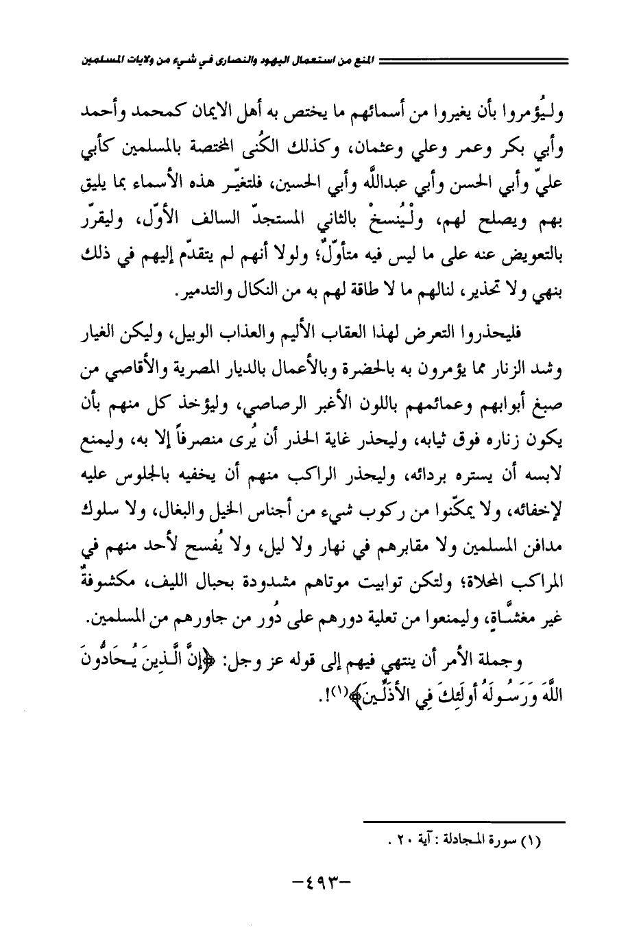 وَلْيُؤْمَرُوا بِأَنْ يُغَيِّرُوا مِنْ أَسْمَائِهِمْ مَا يَخْتَصُّ بِهِ أَهْلُ الْإِيمَانِ كَمُحَمَّدٍ وَأَحْمَدَ وَأَبِي بَكْرٍ وَعُمَرَ وَعَلِيٍّ وَعُثْمَانَ، وَكَذَلِكَ الْكُنَى الْمُخْتَصَّةُ بِالْمُسْلِمِينَ كَأَبِي عَلِيٍّ وَأَبِي الْحَسَنِ وَأَبِي عَبْدِ اللَّهِ وَأَبِي الْحُسَيْنِ، فَلْتُغَيَّرْ هَذِهِ الْأَسْمَاءُ بِمَا يَلِيقُ بِهِمْ وَيَصْلُحُ لَهُمْ، وَلْيُنْسَخْ بِالثَّانِي الْمُسْتَجَدِّ السَّالِفِ الْأَوَّلِ، وَلْيُقَرَّرْ بِالتَّعْوِيضِ عَنْهُ عَلَى مَا لَيْسَ فِيهِ مُتَأَوَّلٌ، وَلَوْلَا أَنَّهُمْ لَمْ يُتَقَدَّمْ إِلَيْهِمْ فِي ذَلِكَ بِنَهْيٍ وَلَا تَحْذِيرٍ، لَنَالَهُمْ مَا لَا طَاقَةَ لَهُمْ بِهِ مِنَ النَّكَالِ وَالتَّدْمِيرِ.