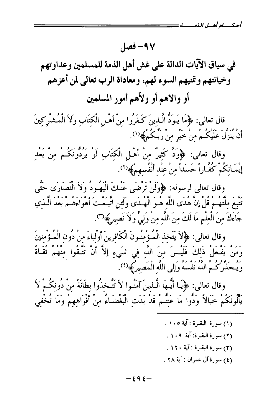 فِي سِيَاقِ الْآيَاتِ الدَّالَّةِ عَلَى غِشِّ أَهْلِ الذِّمَّةِ لِلْمُسْلِمِينَ وَعَدَاوَتِهِمْ وَخِيَانَتِهِمْ وَتَمَنِّيهِمُ السُّوءَ لَهُمْ، وَمُعَادَاةِ الرَّبِّ تَعَالَى لِمَنْ أَعَزَّهُمْ أَوْ وَالَاهُمْ أَوْ وَلَّاهُمْ أُمُورَ الْمُسْلِمِينَ.