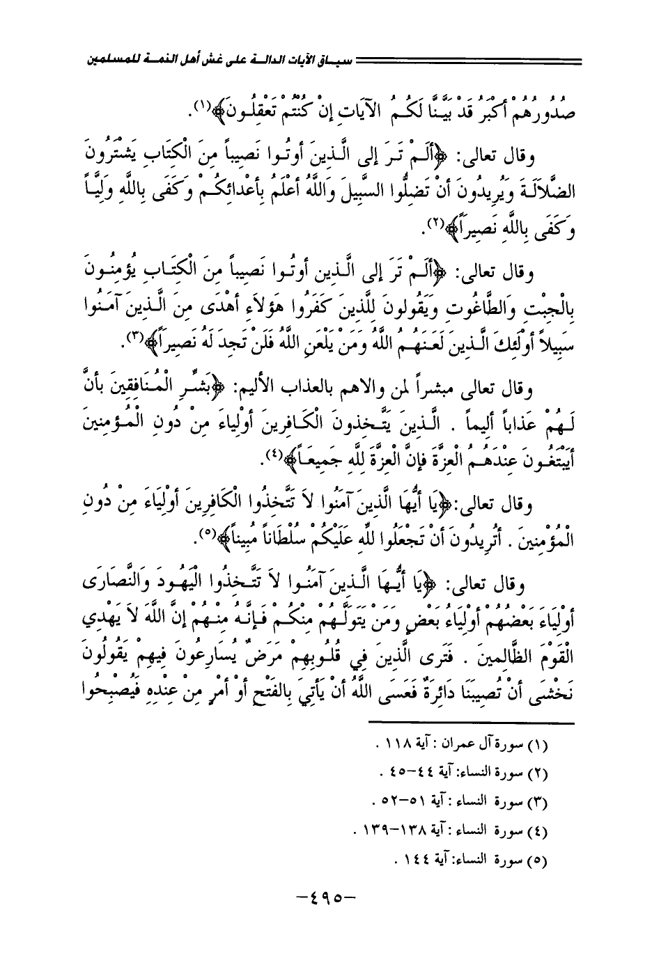 وَقَالَ تَعَالَى: {يَاأَيُّهَا الَّذِينَ آمَنُوا لَا تَتَّخِذُوا الْكَافِرِينَ أَوْلِيَاءَ مِنْ دُونِ الْمُؤْمِنِينَ أَتُرِيدُونَ أَنْ تَجْعَلُوا لِلَّهِ عَلَيْكُمْ سُلْطَانًا مُبِينًا} [النساء: 144] .
