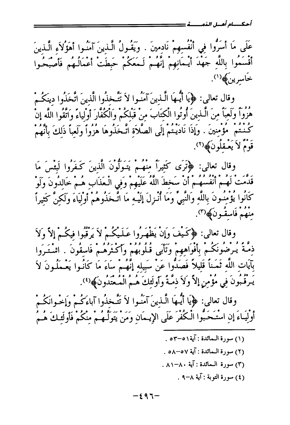 وَقَالَ تَعَالَى: {كَيْفَ وَإِنْ يَظْهَرُوا عَلَيْكُمْ لَا يَرْقُبُوا فِيكُمْ إِلًّا وَلَا ذِمَّةً يُرْضُونَكُمْ بِأَفْوَاهِهِمْ وَتَأْبَى قُلُوبُهُمْ وَأَكْثَرُهُمْ فَاسِقُونَ - اشْتَرَوْا بِآيَاتِ اللَّهِ ثَمَنًا قَلِيلًا فَصَدُّوا عَنْ سَبِيلِهِ إِنَّهُمْ سَاءَ مَا كَانُوا يَعْمَلُونَ - لَا يَرْقُبُونَ فِي مُؤْمِنٍ إِلًّا وَلَا ذِمَّةً وَأُولَئِكَ هُمُ الْمُعْتَدُونَ} [التوبة: 8 - 10] وَقَالَ تَعَالَى: {يَاأَيُّهَا الَّذِينَ آمَنُوا لَا تَتَّخِذُوا آبَاءَكُمْ وَإِخْوَانَكُمْ أَوْلِيَاءَ إِنِ اسْتَحَبُّوا الْكُفْرَ عَلَى الْإِيمَانِ وَمَنْ يَتَوَلَّهُمْ مِنْكُمْ فَأُولَئِكَ هُمُ الظَّالِمُونَ} [التوبة: 23] .