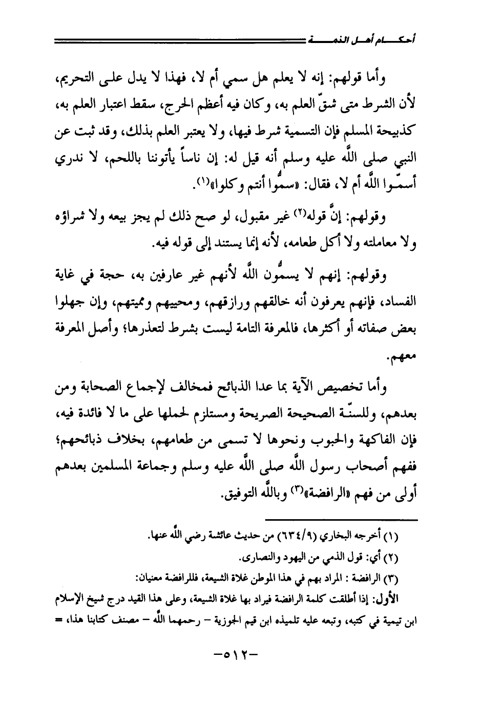 وَأَمَّا تَخْصِيصُ الْآيَةِ بِمَا عَدَا الذَّبَائِحَ فَمُخَالِفٌ لِإِجْمَاعِ الصَّحَابَةِ وَمَنْ بَعْدَهُمْ، وَلِلسُّنَّةِ الصَّحِيحَةِ الصَّرِيحَةِ وَمُسْتَلْزِمٌ لِحَمْلِهَا عَلَى مَا لَا فَائِدَةَ فِيهِ، فَإِنَّ الْفَاكِهَةَ وَالْحُبُوبَ وَنَحْوَهَا لَا تُسَمَّى مِنْ طَعَامِهِمْ، بِخِلَافِ ذَبَائِحِهِمْ، فَفَهْمُ أَصْحَابِ رَسُولِ اللَّهِ - صَلَّى اللَّهُ عَلَيْهِ وَسَلَّمَ - وَجَمَاعَةِ الْمُسْلِمِينَ بَعْدَهُمْ أَوْلَى مِنْ فَهْمِ " الرَّافِضَةِ "، وَبِاللَّهِ التَّوْفِيقُ.