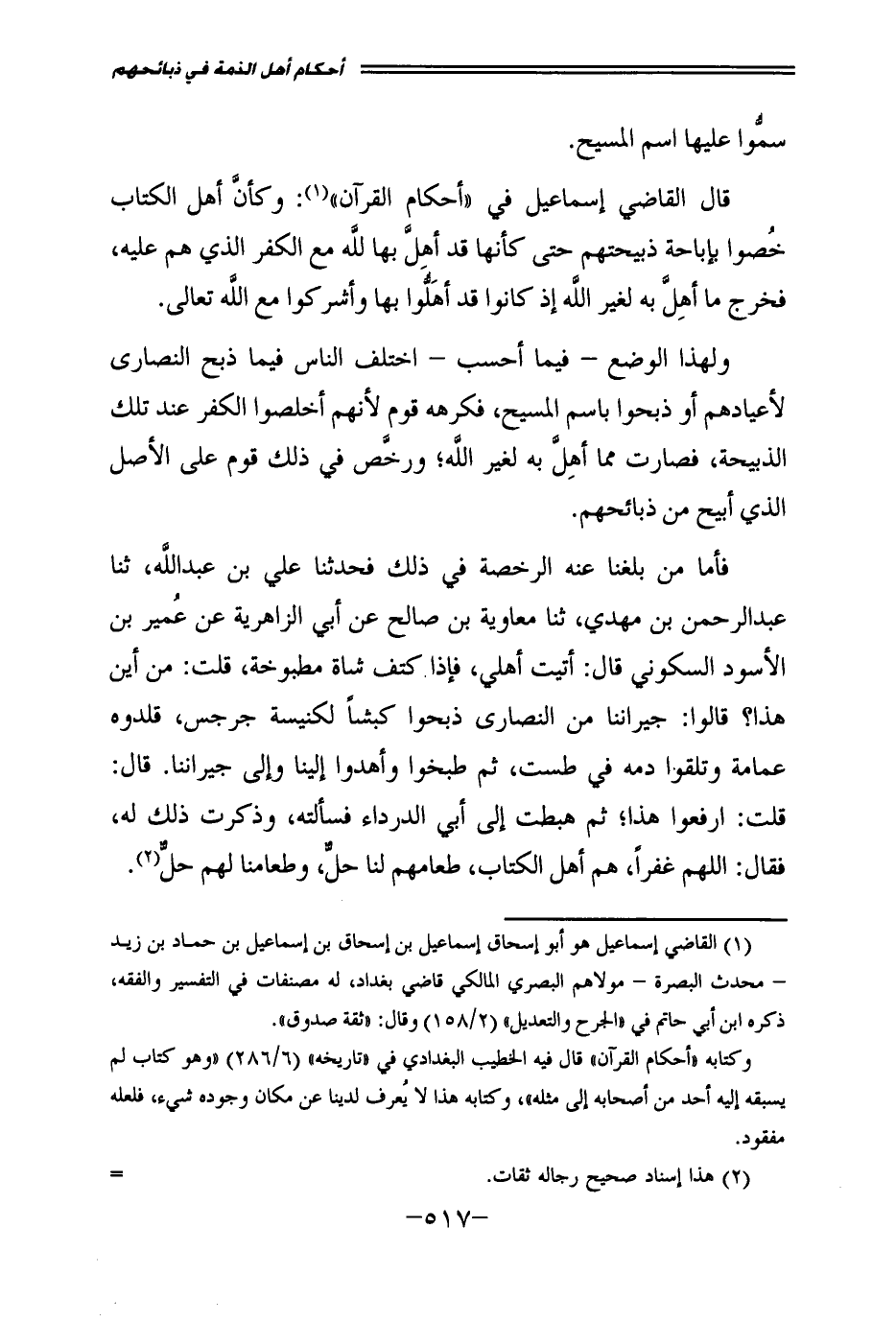 فَأَمَّا مَنْ بَلَغَنَا عَنْهُ الرُّخْصَةُ فِي ذَلِكَ فَحَدَّثَنَا عَلِيُّ بْنُ عَبْدِ اللَّهِ، ثَنَا عَبْدُ الرَّحْمَنِ بْنُ مَهْدِيٍّ، ثَنَا مُعَاوِيَةُ بْنُ صَالِحٍ عَنْ أَبِي الزَّاهِرِيَّةِ عَنْ عُمَيْرِ بْنِ الْأَسْوَدِ السُّكُونِيِّ قَالَ: أَتَيْتُ أَهْلِي فَإِذَا كَتِفُ شَاةٍ مَطْبُوخَةٌ، قُلْتُ مِنْ أَيْنَ هَذَا؟ قَالُوا جِيرَانُنَا مِنَ النَّصَارَى ذَبَحُوا كَبْشًا لِكَنِيسَةِ جِرْجِسَ، قَلَّدُوهُ عِمَامَةً وَتَلَقَّوْا دَمَهُ فِي طَسْتٍ، ثُمَّ طَبَخُوا وَأَهْدَوْا إِلَيْنَا وَإِلَى جِيرَانِنَا، قَالَ: قُلْتُ: ارْفَعُوا هَذَا ثُمَّ هَبَطْتُ إِلَى أَبِي الدَّرْدَاءِ فَسَأَلْتُهُ، وَذَكَرْتُ ذَلِكَ لَهُ، فَقَالَ: اللَّهُمَّ غُفْرًا، هُمْ أَهْلُ الْكِتَابِ طَعَامُهُمْ لَنَا حِلٌّ وَطَعَامُنَا لَهُمْ حِلٌّ.