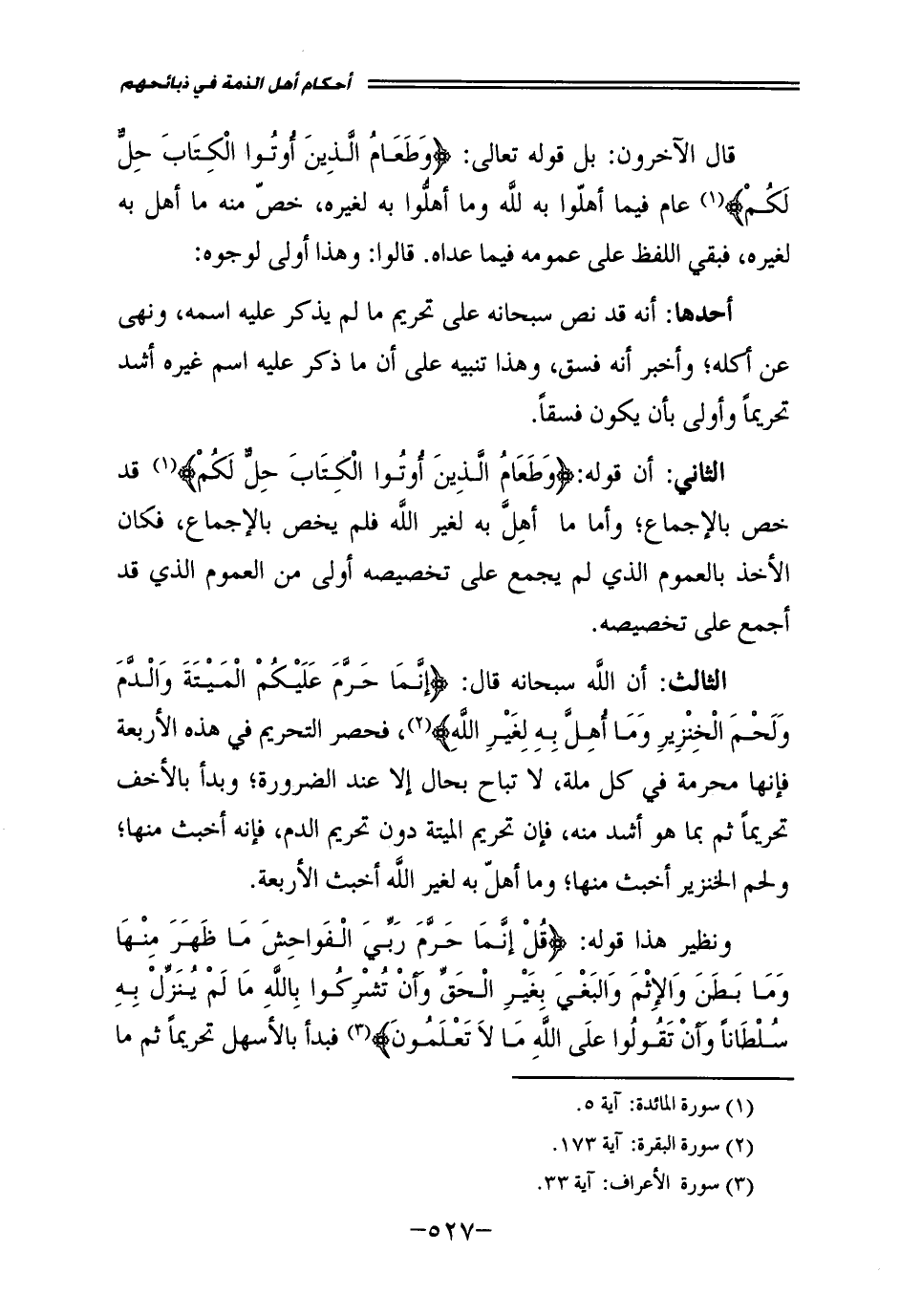 قَالَ الْآخَرُونَ بَلْ قَوْلُهُ تَعَالَى: {وَطَعَامُ الَّذِينَ أُوتُوا الْكِتَابَ حِلٌّ لَكُمْ} [المائدة: 5] ، عَامٌّ فِيمَا أَهَلُّوا بِهِ لِلَّهِ وَمَا أَهَلُّوا بِهِ لِغَيْرِهِ، خَصَّ مِنْهُ مَا أُهِلَّ بِهِ لِغَيْرِهِ، فَبَقِيَ اللَّفْظُ عَلَى عُمُومِهِ فِيمَا عَدَاهُ، قَالُوا: وَهَذَا أَوْلَى لِوُجُوهٍ.