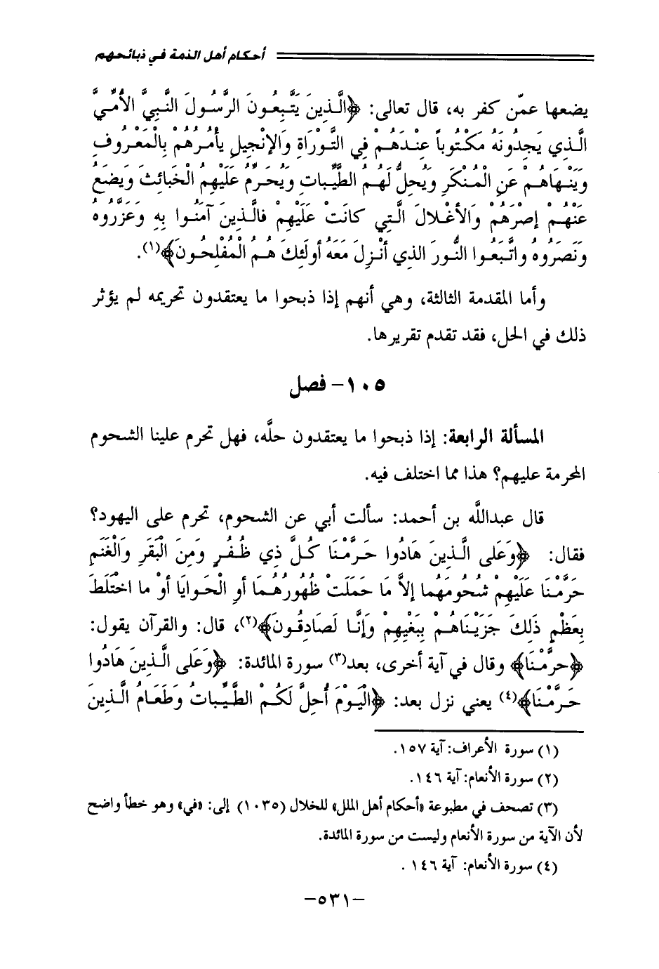 قَالَ عَبْدُ اللَّهِ بْنُ أَحْمَدَ: سَأَلْتُ أَبِي عَنِ الشُّحُومِ، تُحَرَّمُ عَلَى الْيَهُودِ؟ فَقَالَ: {وَعَلَى الَّذِينَ هَادُوا حَرَّمْنَا كُلَّ ذِي ظُفُرٍ وَمِنَ الْبَقَرِ وَالْغَنَمِ حَرَّمْنَا عَلَيْهِمْ شُحُومَهُمَا إِلَّا مَا حَمَلَتْ ظُهُورُهُمَا أَوِ الْحَوَايَا أَوْ مَا اخْتَلَطَ بِعَظْمٍ ذَلِكَ جَزَيْنَاهُمْ بِبَغْيِهِمْ وَإِنَّا لَصَادِقُونَ} [الأنعام: 146] ، قَالَ: وَالْقُرْآنُ يَقُولُ: حَرَّمْنَا، وَقَالَ فِي آيَةٍ أُخْرَى بَعْدَ سُورَةِ الْمَائِدَةِ: {وَعَلَى الَّذِينَ هَادُوا حَرَّمْنَا} [الأنعام: 146] ، يَعْنِي نَزَلَ بَعْدَ: {الْيَوْمَ أُحِلَّ لَكُمُ الطَّيِّبَاتُ وَطَعَامُ الَّذِينَ أُوتُوا الْكِتَابَ حِلٌّ لَكُمْ وَطَعَامُكُمْ حِلٌّ لَهُمْ} [المائدة: 5] ،
