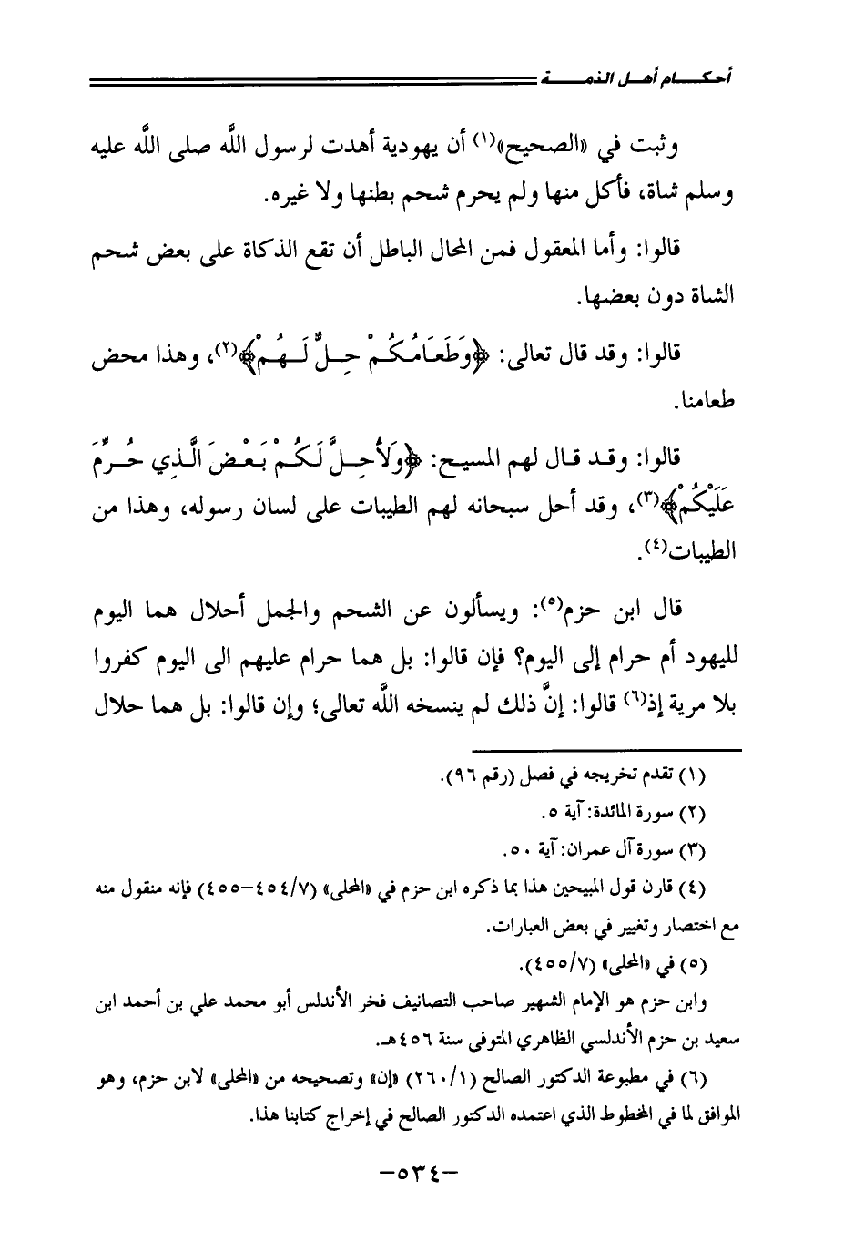 قَالَ ابْنُ حَزْمٍ: وَيَسْأَلُونَ عَنِ الشَّحْمِ وَالْحَمْلِ أَحَلَالٌ هُمَا الْيَوْمَ لِلْيَهُودِ أَمْ حَرَامٌ إِلَى الْيَوْمِ؟ فَإِنْ قَالُوا: بَلْ هُمَا حَرَامٌ عَلَيْهِمْ إِلَى الْيَوْمِ كَفَرُوا بِلَا مِرْيَةٍ إِذْ قَالُوا: إِنَّ ذَلِكَ لَمْ يَنْسَخْهُ اللَّهُ تَعَالَى، وَإِنْ قَالُوا: بَلْ هُمَا حَلَالٌ