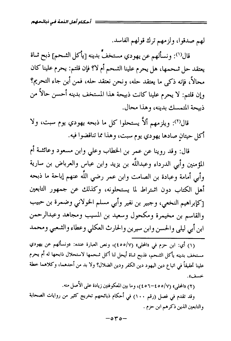 قَالَ: وَيَلْزَمُهُمْ أَلَّا يَسْتَحِلُّوا كُلَّ مَا ذَبَحَهُ يَهُودِيٌّ يَوْمَ سَبْتٍ، وَلَا أَكْلَ حِيتَانٍ صَادَهَا يَهُودِيٌّ يَوْمَ سَبْتٍ وَهَذَا مِمَّا تَنَاقَضُوا فِيهِ.