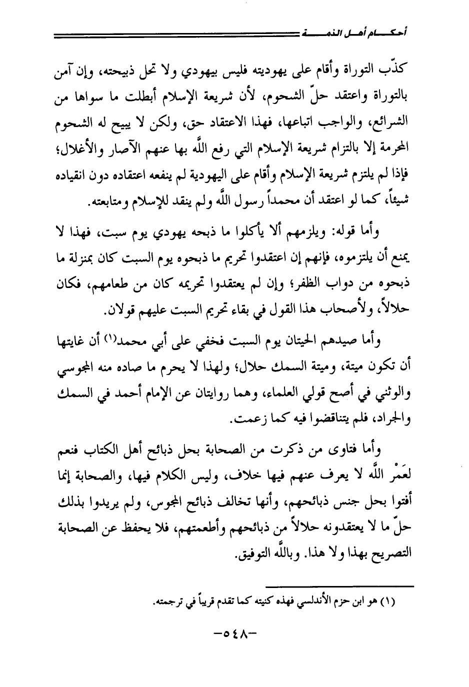 وَأَمَّا فَتَاوَى مَنْ ذَكَرْتَ مِنَ الصَّحَابَةِ بِحِلِّ ذَبَائِحِ أَهْلِ الْكِتَابِ فَنَعَمْ لَعَمْرُ اللَّهِ لَا يُعْرَفُ عَنْهُمْ فِيهَا خِلَافٌ، وَلَيْسَ الْكَلَامُ فِيهَا، وَالصَّحَابَةُ إِنَّمَا أَفْتَوْا بِحِلِّ جِنْسِ ذَبَائِحِهِمْ، وَأَنَّهَا تُخَالِفُ ذَبَائِحَ الْمَجُوسِ، وَلَمْ يُرِيدُوا بِذَلِكَ حِلَّ مَا لَا يَعْتَقِدُونَهُ حَلَالًا مِنْ ذَبَائِحِهِمْ وَأَطْعِمَتِهِمْ، فَلَا يُحْفَظُ عَنِ الصَّحَابَةِ التَّصْرِيحُ بِهَذَا وَلَا هَذَا، وَبِاللَّهِ التَّوْفِيقُ.