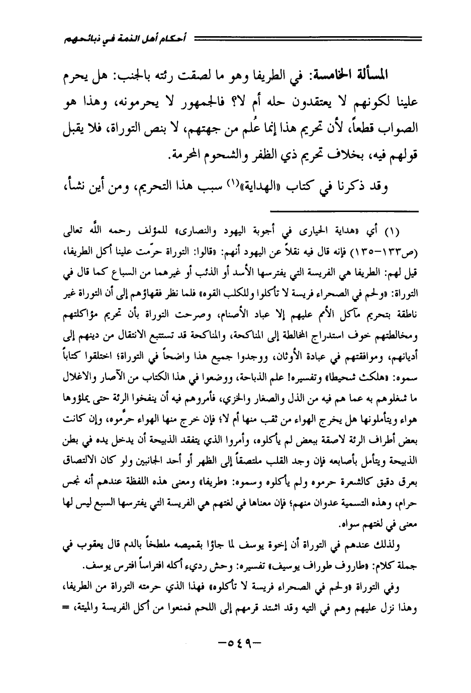 [الْمَسْأَلَةُ الْخَامِسَةُ فِي الطَّرِيفَا وَهُوَ مَا لَصِقَتْ رِئَتُهُ بِالْجَنْبِ هَلْ يُحَرَّمُ عَلَيْنَا]