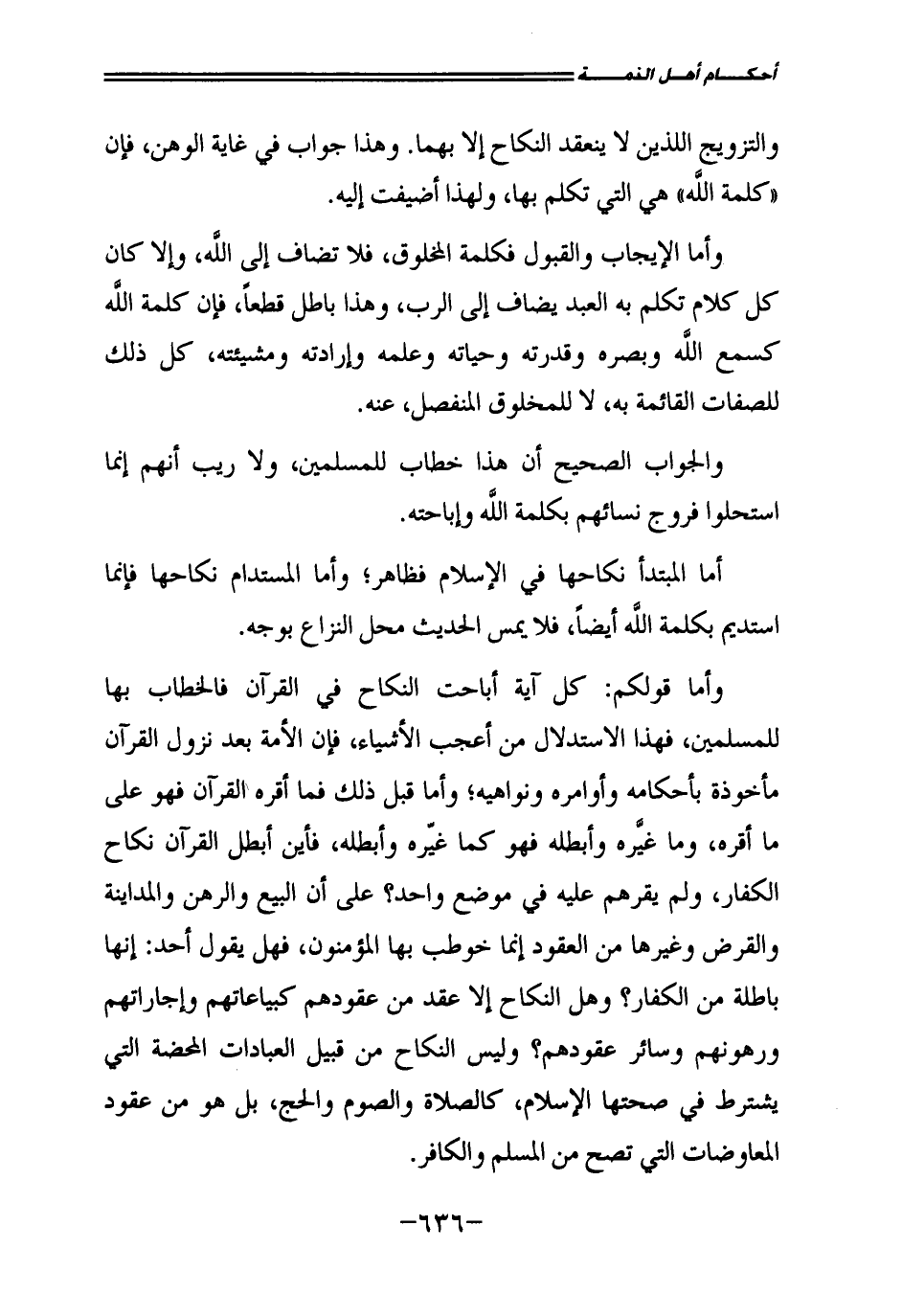 وَأَمَّا قَوْلُكُمْ: كُلُّ آيَةٍ أَبَاحَتِ النِّكَاحَ فِي الْقُرْآنِ فَالْخِطَابُ بِهَا لِلْمُسْلِمِينَ، فَهَذَا الِاسْتِدْلَالُ مِنْ أَعْجَبِ الْأَشْيَاءِ، فَإِنَّ الْأُمَّةَ بَعْدَ نُزُولِ الْقُرْآنِ مَأْخُوذَةٌ بِأَحْكَامِهِ، وَأَوَامِرِهِ، وَنَوَاهِيهِ، وَأَمَّا قَبْلَ ذَلِكَ فَمَا أَقَرَّهُ الْقُرْآنُ فَهُوَ عَلَى مَا أَقَرَّهُ، وَمَا غَيَّرَهُ وَأَبْطَلَهُ فَهُوَ كَمَا غَيَّرَهُ وَأَبْطَلَهُ، فَأَيْنَ أَبْطَلَ الْقُرْآنُ نِكَاحَ الْكُفَّارِ، وَلَمْ يُقِرَّهُمْ عَلَيْهِ فِي مَوْضِعٍ وَاحِدٍ؟ عَلَى أَنَّ الْبَيْعَ، وَالرَّهْنَ، وَالْمُدَايَنَةَ، وَالْقَرْضَ، وَغَيْرَهَا مِنَ الْعُقُودِ إِنَّمَا خُوطِبَ بِهَا الْمُؤْمِنُونَ، فَهَلْ يَقُولُ أَحَدٌ: إِنَّهَا بَاطِلَةٌ مِنَ الْكُفَّارِ؟ وَهَلِ النِّكَاحُ إِلَّا عَقْدٌ مِنْ عُقُودِهِمْ كَبِيَاعَاتِهِمْ، وَإِجَارَاتِهِمْ، وَرُهُونِهِمْ، وَسَائِرِ عُقُودِهِمْ؟ وَلَيْسَ النِّكَاحُ مِنْ قَبِيلِ الْعِبَادَاتِ الْمَحْضَةِ الَّتِي يُشْتَرَطُ فِي صِحَّتِهَا الْإِسْلَامُ، كَالصَّلَاةِ وَالصَّوْمِ وَالْحَجِّ، بَلْ هُوَ مِنْ عُقُودِ الْمُعَاوَضَاتِ الَّتِي تَصِحُّ مِنَ الْمُسْلِمِ، وَالْكَافِرِ.