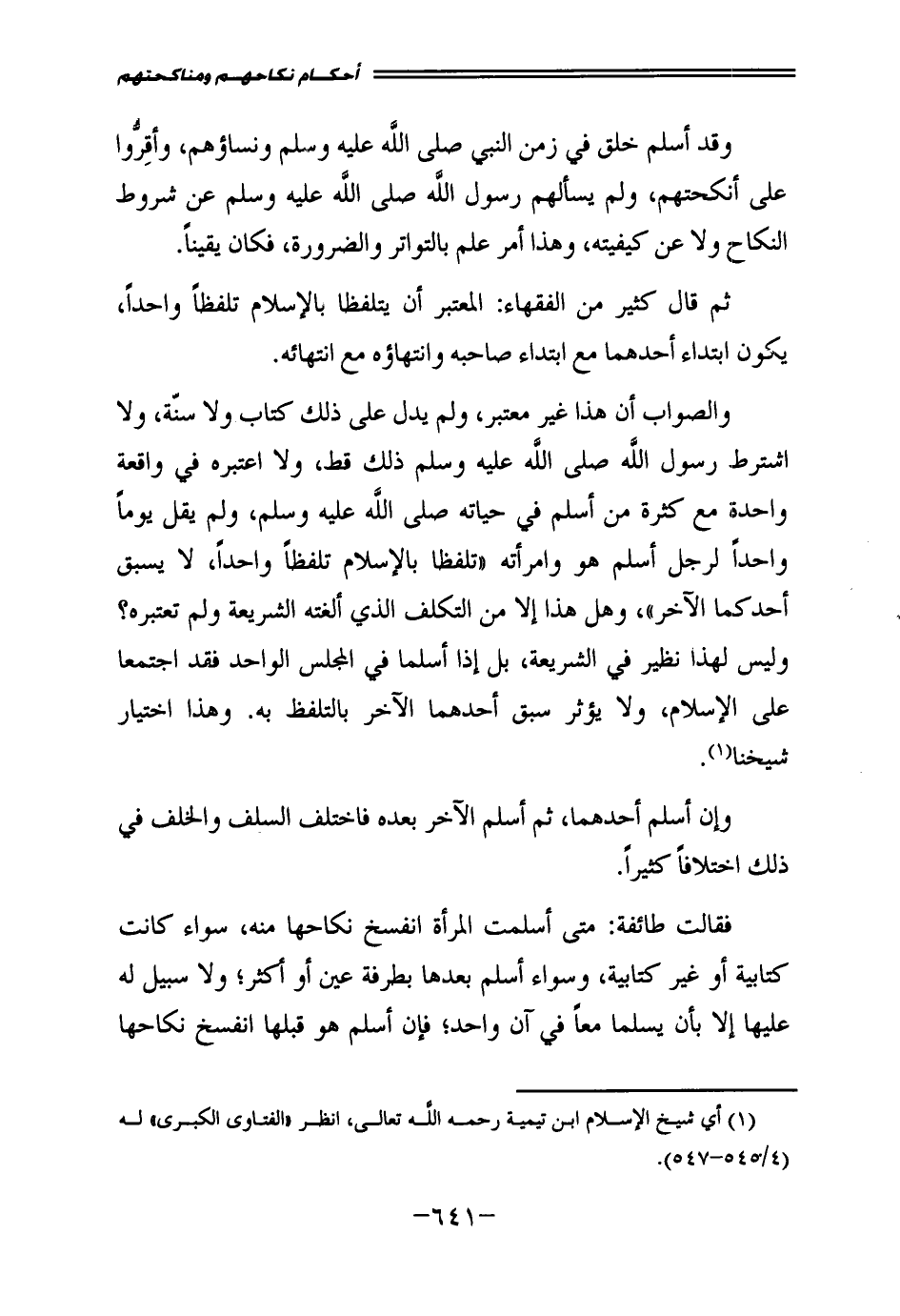 وَالصَّوَابُ أَنَّ هَذَا غَيْرُ مُعْتَبَرٍ، وَلَمْ يَدُلَّ عَلَى ذَلِكَ كِتَابٌ وَلَا سُنَّةٌ، وَلَا اشْتَرَطَ رَسُولُ اللَّهِ - صَلَّى اللَّهُ عَلَيْهِ وَسَلَّمَ - ذَلِكَ قَطُّ، وَلَا اعْتَبَرَهُ فِي وَاقِعَةٍ وَاحِدَةٍ مَعَ كَثْرَةِ مَنْ أَسْلَمَ فِي حَيَاتِهِ - صَلَّى اللَّهُ عَلَيْهِ وَسَلَّمَ -، وَلَمْ يَقُلْ يَوْمًا وَاحِدًا لِرَجُلٍ أَسْلَمَ هُوَ وَامْرَأَتُهُ: " تَلَفَّظَا بِالْإِسْلَامِ تَلَفُّظًا وَاحِدًا لَا يَسْبِقُ أَحَدُكُمَا الْآخَرَ "، وَهَلْ هَذَا إِلَّا مِنَ التَّكَلُّفِ الَّذِي أَلْغَتْهُ الشَّرِيعَةُ وَلَمْ تَعْتَبِرْهُ؟ وَلَيْسَ لِهَذَا نَظِيرٌ فِي الشَّرِيعَةِ، بَلْ إِذَا أَسْلَمَا فِي الْمَجْلِسِ الْوَاحِدِ فَقَدِ اجْتَمَعَا عَلَى الْإِسْلَامِ، وَلَا يُؤَثِّرُ سَبْقُ أَحَدِهِمَا الْآخَرَ بِالتَّلَفُّظِ بِهِ. وَهَذَا اخْتِيَارُ شَيْخِنَا.