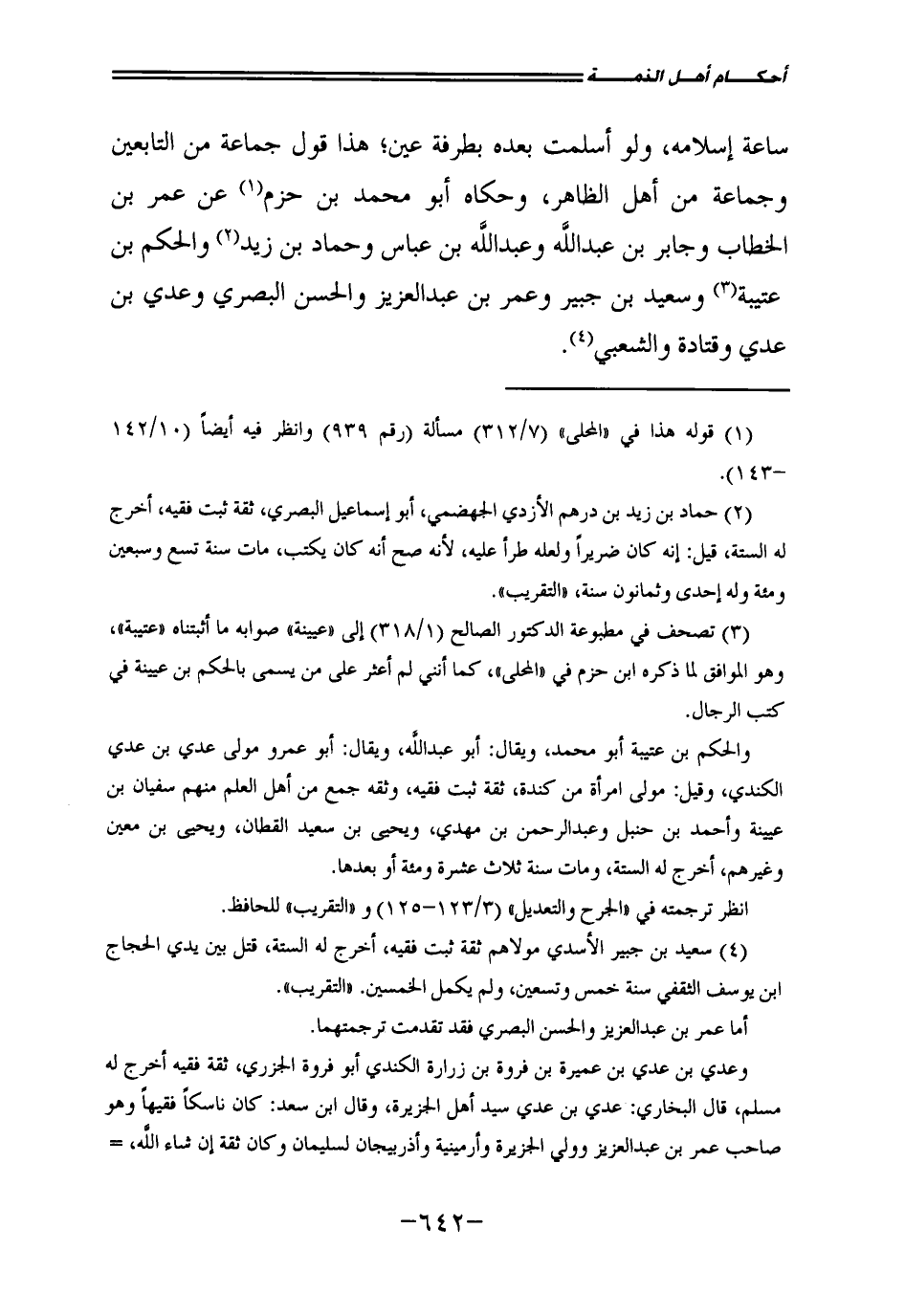 سَاعَةَ إِسْلَامِهِ، وَلَوْ أَسْلَمَتْ بَعْدَهُ بِطَرْفَةِ عَيْنٍ، هَذَا قَوْلُ جَمَاعَةٍ مِنَ التَّابِعِينَ وَجَمَاعَةٍ مِنْ أَهْلِ الظَّاهِرِ، وَحَكَاهُ أَبُو مُحَمَّدِ بْنُ حَزْمٍ، عَنْ عُمَرَ بْنِ الْخَطَّابِ وَجَابِرِ بْنِ عَبْدِ اللَّهِ، وَعَبْدِ اللَّهِ بْنِ عَبَّاسٍ، وَحَمَّادِ بْنِ زَيْدٍ وَالْحَكَمِ بْنِ عُتَيْبَةَ، وَسَعِيدِ بْنِ جُبَيْرٍ، وَعُمَرَ بْنِ عَبْدِ الْعَزِيزِ، وَالْحَسَنِ الْبَصْرِيِّ، وَعَدِيِّ بْنِ عَدِيٍّ، وَقَتَادَةَ، وَالشَّعْبِيِّ.