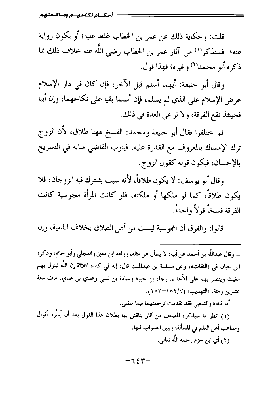 قُلْتُ: وَحِكَايَةُ ذَلِكَ عَنْ عُمَرَ بْنِ الْخَطَّابِ غَلَطٌ عَلَيْهِ، أَوْ يَكُونُ رِوَايَةً عَنْهُ، فَسَنَذْكُرُ مِنْ آثَارِ عُمَرَ بْنِ الْخَطَّابِ - رَضِيَ اللَّهُ عَنْهُ - خِلَافَ ذَلِكَ مِمَّا ذَكَرَهُ أَبُو مُحَمَّدٍ، وَغَيْرُهُ، فَهَذَا قَوْلٌ.