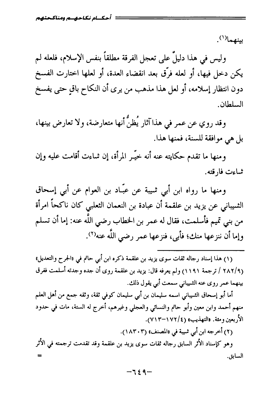 وَمِنْهَا مَا رَوَاهُ ابْنُ أَبِي شَيْبَةَ، عَنْ عَبَّادِ بْنِ الْعَوَّامِ، عَنْ أَبِي إِسْحَاقَ الشَّيْبَانِيِّ، عَنْ يَزِيدَ بْنِ عَلْقَمَةَ أَنَّ عُبَادَةَ بْنَ النُّعْمَانِ الثَّعْلَبِيَّ كَانَ نَاكِحًا امْرَأَةً مِنْ بَنِي تَمِيمٍ فَأَسْلَمَتْ، فَقَالَ لَهُ عُمَرُ بْنُ الْخَطَّابِ - رَضِيَ اللَّهُ عَنْهُ -: إِمَّا أَنْ تُسْلِمَ وَإِمَّا أَنْ نَنْزِعَهَا مِنْكَ، فَأَبَى، فَنَزَعَهَا عُمَرُ - رَضِيَ اللَّهُ عَنْهُ.