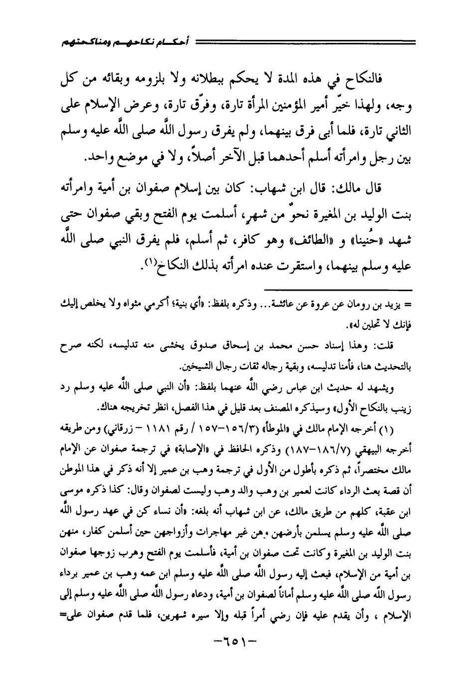 قَالَ مَالِكٌ: قَالَ ابْنُ شِهَابٍ: كَانَ بَيْنَ إِسْلَامِ صَفْوَانَ بْنِ أُمَيَّةَ وَامْرَأَتِهِ بِنْتِ الْوَلِيدِ بْنِ الْمُغِيرَةِ نَحْوٌ مِنْ شَهْرٍ، أَسْلَمَتْ يَوْمَ الْفَتْحِ، وَبَقِيَ صَفْوَانُ حَتَّى شَهِدَ " حُنَيْنًا " وَ " الطَّائِفَ "، وَهُوَ كَافِرٌ، ثُمَّ أَسْلَمَ، فَلَمْ يُفَرِّقِ النَّبِيُّ - صَلَّى اللَّهُ عَلَيْهِ وَسَلَّمَ - بَيْنَهُمَا، وَاسْتَقَرَّتْ عِنْدَهُ امْرَأَتُهُ بِذَلِكَ النِّكَاحِ.