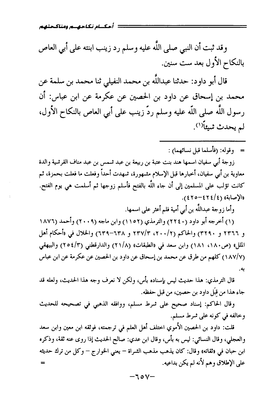 قَالَ أَبُو دَاوُدَ: حَدَّثَنَا عَبْدُ اللَّهِ بْنُ مُحَمَّدٍ النُّفَيْلِيُّ، ثَنَا مُحَمَّدُ بْنُ سَلَمَةَ، عَنْ مُحَمَّدِ بْنِ إِسْحَاقَ، عَنْ دَاوُدَ بْنِ الْحُصَيْنِ، عَنْ عِكْرِمَةَ، عَنِ ابْنِ عَبَّاسٍ: «أَنَّ رَسُولَ اللَّهِ - صَلَّى اللَّهُ عَلَيْهِ وَسَلَّمَ - رَدَّ زَيْنَبَ عَلَى أَبِي الْعَاصِ بِالنِّكَاحِ الْأَوَّلِ، لَمْ يُحْدِثْ شَيْئًا» .