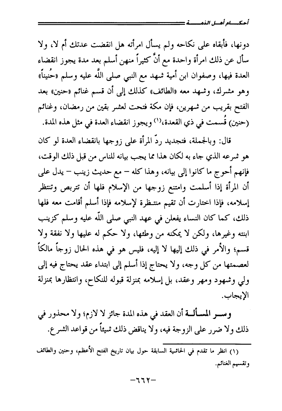 دُونَهَا، فَأَبْقَاهُ عَلَى نِكَاحِهِ، وَلَمْ يَسْأَلِ امْرَأَتَهُ هَلِ انْقَضَتْ عِدَّتُكِ أَمْ لَا؟ وَلَا سَأَلَ عَنْ ذَلِكَ امْرَأَةً وَاحِدَةً مَعَ أَنَّ كَثِيرًا مِنْهُنَّ أَسْلَمَ بَعْدَ مُدَّةٍ يَجُوزُ انْقِضَاءُ الْعِدَّةِ فِيهَا، وَصَفْوَانُ ابْنُ أُمَيَّةَ شَهِدَ مَعَ النَّبِيِّ - صَلَّى اللَّهُ عَلَيْهِ وَسَلَّمَ - " حُنَيْنًا "، وَهُوَ مُشْرِكٌ، وَشَهِدَ مَعَهُ " الطَّائِفَ " كَذَلِكَ إِلَى أَنْ قَسَّمَ غَنَائِمَ " حُنَيْنٍ " بَعْدَ الْفَتْحِ بِقَرِيبٍ مِنْ شَهْرَيْنِ، فَإِنَّ مَكَّةَ فُتِحَتْ لِعَشْرٍ بَقِينَ مِنْ رَمَضَانَ، وَغَنَائِمُ (حُنَيْنٍ) قُسِّمَتْ فِي ذِي الْقَعْدَةِ، وَيَجُوزُ انْقِضَاءُ الْعِدَّةِ فِي مِثْلِ هَذِهِ الْمُدَّةِ.