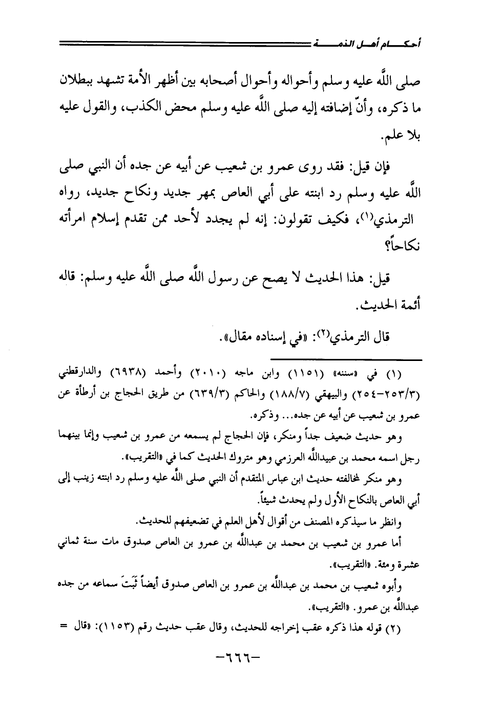 فَإِنْ قِيلَ: فَقَدْ رَوَى عَمْرُو بْنُ شُعَيْبٍ، عَنْ أَبِيهِ، عَنْ جَدِّهِ «أَنَّ النَّبِيَّ - صَلَّى اللَّهُ عَلَيْهِ وَسَلَّمَ - رَدَّ ابْنَتَهُ عَلَى أَبِي الْعَاصِ بِمَهْرٍ جَدِيدٍ، وَنِكَاحٍ جَدِيدٍ» رَوَاهُ التِّرْمِذِيُّ، فَكَيْفَ تَقُولُونَ: إِنَّهُ لَمْ يُجَدِّدْ لِأَحَدٍ مِمَّنْ تَقَدَّمَ إِسْلَامُ امْرَأَتِهِ نِكَاحًا؟
