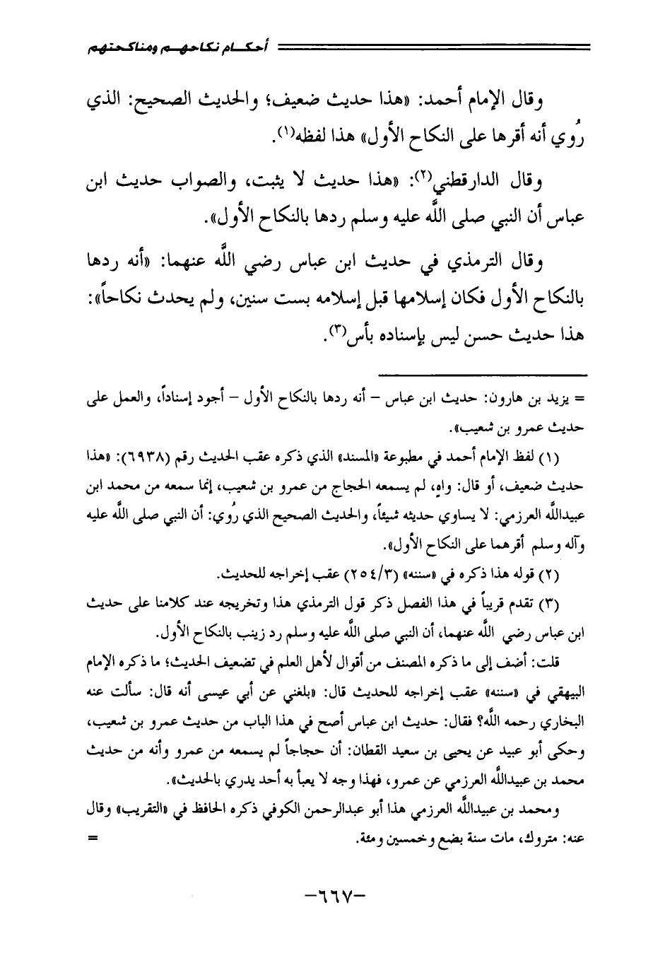 وَقَالَ الْإِمَامُ أَحْمَدُ: " هَذَا حَدِيثٌ ضَعِيفٌ، وَالْحَدِيثُ الصَّحِيحُ: الَّذِي رُوِيَ أَنَّهُ أَقَرَّهَا عَلَى النِّكَاحِ الْأَوَّلِ " هَذَا لَفْظُهُ.