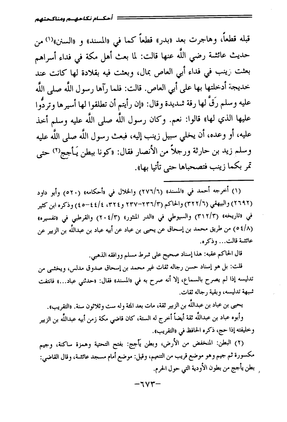 قَبْلَهُ قَطْعًا، وَهَاجَرَتْ بَعْدَ " بَدْرٍ " قَطْعًا كَمَا فِي " الْمُسْنَدِ "، وَ " السُّنَنِ " مِنْ «حَدِيثِ عَائِشَةَ - رَضِيَ اللَّهُ عَنْهَا - قَالَتْ: لَمَّا بَعَثَ أَهْلُ مَكَّةَ فِي فِدَاءِ أَسْرَاهُمْ بَعَثَتْ زَيْنَبُ فِي فِدَاءِ أَبِي الْعَاصِ بِمَالٍ، وَبَعَثَتْ فِيهِ بِقِلَادَةٍ لَهَا كَانَتْ عِنْدَ خَدِيجَةَ أَدْخَلَتْهَا بِهَا عَلَى أَبِي الْعَاصِ. قَالَتْ فَلَمَّا رَآهَا رَسُولُ اللَّهِ - صَلَّى اللَّهُ عَلَيْهِ وَسَلَّمَ - رَقَّ لَهَا رِقَّةً شَدِيدَةً، وَقَالَ: " إِنْ رَأَيْتُمْ أَنْ تُطْلِقُوا لَهَا أَسِيرَهَا وَتَرُدُّوا عَلَيْهَا الَّذِي لَهَا "، قَالُوا: نَعَمْ. وَكَانَ رَسُولُ اللَّهِ - صَلَّى اللَّهُ عَلَيْهِ وَسَلَّمَ - أَخَذَ عَلَيْهِ، أَوْ وَعَدَهُ، أَنْ يُخَلِّيَ سَبِيلَ زَيْنَبَ إِلَيْهِ، فَبَعَثَ رَسُولُ اللَّهِ - صَلَّى اللَّهُ عَلَيْهِ وَسَلَّمَ - زَيْدَ بْنَ حَارِثَةَ وَرَجُلًا مِنَ الْأَنْصَارِ، فَقَالَ: " كُونَا بِبَطْنِ يَأْجِجَ حَتَّى تَمُرَّ بِكُمَا زَيْنَبُ فَتَصْحَبَاهَا حَتَّى تَأْتِيَا بِهَا» .