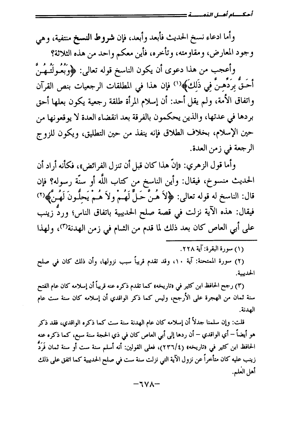 وَأَمَّا قَوْلُ الزُّهْرِيِّ: " إِنَّ هَذَا كَانَ قَبْلَ أَنْ تَنْزِلَ الْفَرَائِضُ "، فَكَأَنَّهُ أَرَادَ أَنَّ الْحَدِيثَ مَنْسُوخٌ، فَيُقَالُ: وَأَيْنَ النَّاسِخُ مِنْ كِتَابِ اللَّهِ أَوْ سُنَّةِ رَسُولِهِ؟ فَإِنْ قَالَ: النَّاسِخُ لَهُ قَوْلُهُ تَعَالَى: {لَا هُنَّ حِلٌّ لَهُمْ وَلَا هُمْ يَحِلُّونَ لَهُنَّ} [الممتحنة: 10] ، فَيُقَالُ: هَذِهِ الْآيَةُ نَزَلَتْ فِي قِصَّةِ صُلْحِ الْحُدَيْبِيَةِ بِاتِّفَاقِ النَّاسِ، وَرَدُّ زَيْنَبَ عَلَى أَبِي الْعَاصِ كَانَ بَعْدَ ذَلِكَ لَمَّا قَدِمَ مِنَ الشَّامِ فِي زَمَنِ الْهُدْنَةِ، وَلِهَذَا
