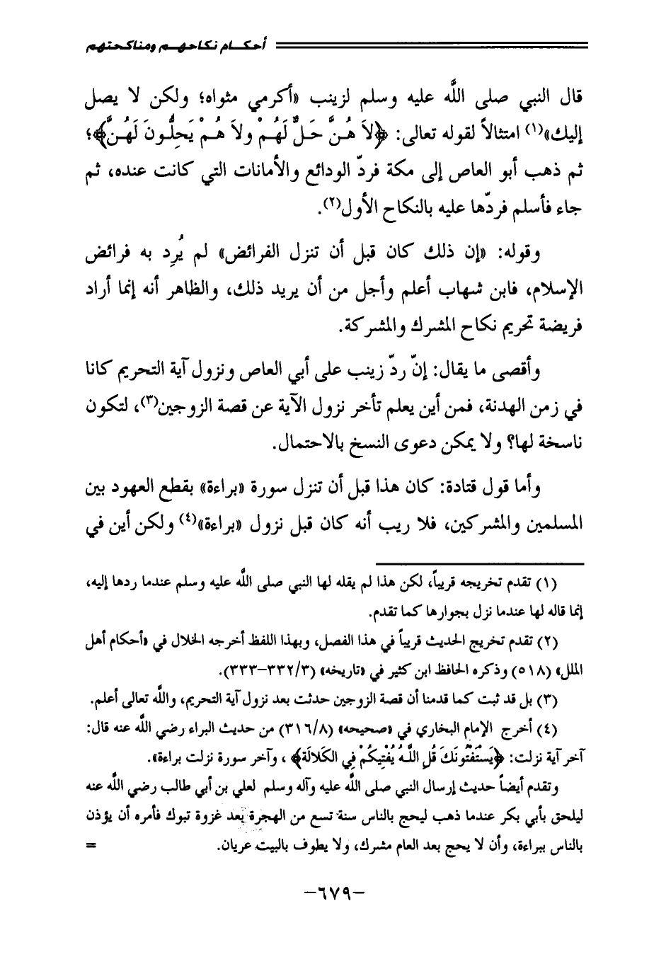 وَأَقْصَى مَا يُقَالُ: إِنَّ رَدَّ زَيْنَبَ عَلَى أَبِي الْعَاصِ، وَنُزُولَ آيَةِ التَّحْرِيمِ كَانَا فِي زَمَنِ الْهُدْنَةِ، فَمِنْ أَيْنَ يُعْلَمُ تَأَخُّرُ نُزُولِ الْآيَةِ عَنْ قِصَّةِ الزَّوْجَيْنِ، لِتَكُونَ نَاسِخَةً لَهَا؟ وَلَا يُمْكِنُ دَعْوَى النَّسْخِ بِالِاحْتِمَالِ.
