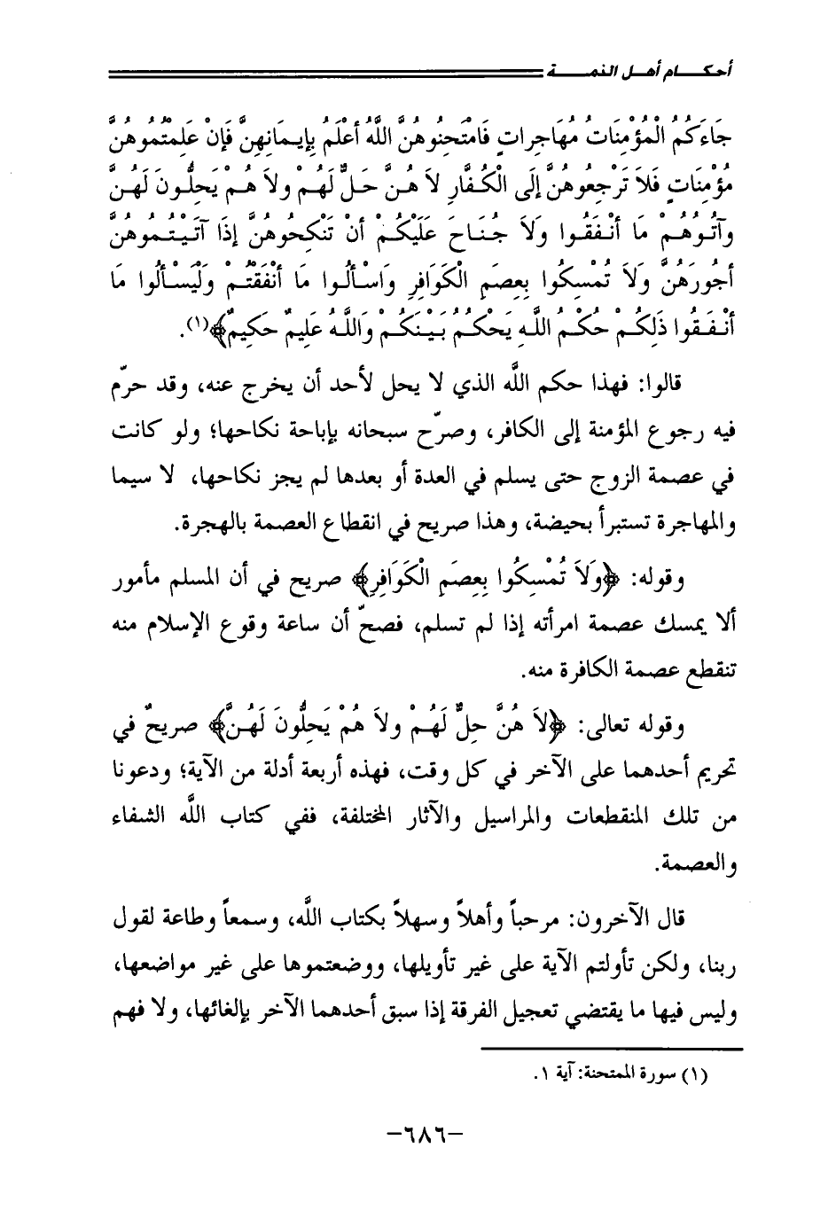 قَالُوا: فَهَذَا حُكْمُ اللَّهِ الَّذِي لَا يُحِلُّ لِأَحَدٍ أَنْ يَخْرُجَ عَنْهُ، وَقَدْ حَرَّمَ فِيهِ رُجُوعَ الْمُؤْمِنَةِ إِلَى الْكَافِرِ، وَصَرَّحَ سُبْحَانَهُ بِإِبَاحَةِ نِكَاحِهَا، وَلَوْ كَانَتْ فِي عِصْمَةِ الزَّوْجِ حَتَّى يُسْلِمَ فِي الْعِدَّةِ، أَوْ بَعْدَهَا لَمْ يَجُزْ نِكَاحُهَا، لَا سِيَّمَا وَالْمُهَاجِرَةُ تُسْتَبْرَأُ بِحَيْضَةٍ، وَهَذَا صَرِيحٌ فِي انْقِطَاعِ الْعِصْمَةِ بِالْهِجْرَةِ.